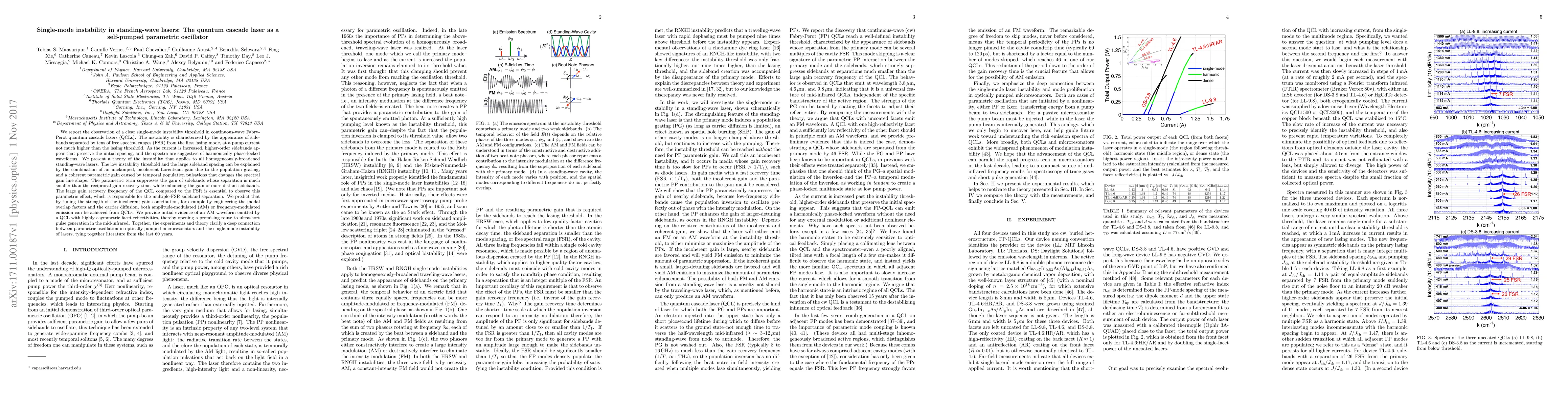 We report the observation of a clear single-mode instability threshold in continuous-wave Fabry-Perot quantum cascade lasers (QCLs). The instability is characterized by the appearance of sidebands separated by tens of free spectral ranges (FSR) from the first lasing mode, at a pump current not much higher than the lasing threshold. As the current is increased, higher-order sidebands appear that preserve the initial spacing, and the spectra are suggestive of harmonically phase-locked waveforms. We present a theory of the instability that applies to all homogeneously broadened standing-wave lasers. The low instability threshold and the large sideband spacing can be explained by the combination of an unclamped, incoherent Lorentzian gain due to the population grating, and a coherent parametric gain caused by temporal population pulsations that changes the spectral gain line shape. The parametric term suppresses the gain of sidebands whose separation is much smaller than the reciprocal gain recovery time, while enhancing the gain of more distant sidebands. The large gain recovery frequency of the QCL compared to the FSR is essential to observe this parametric effect, which is responsible for the multiple-FSR sideband separation. We predict that by tuning the strength of the incoherent gain contribution, for example by engineering the modal overlap factors and the carrier diffusion, both amplitude-modulated (AM) or frequency-modulated emission can be achieved from QCLs. We provide initial evidence of an AM waveform emitted by a QCL with highly asymmetric facet reflectivities, thereby opening a promising route to ultrashort pulse generation in the mid-infrared. Together, the experiments and theory clarify a deep connection between parametric oscillation in optically pumped microresonators and the single-mode instability of lasers, tying together literature from the last 60 years.