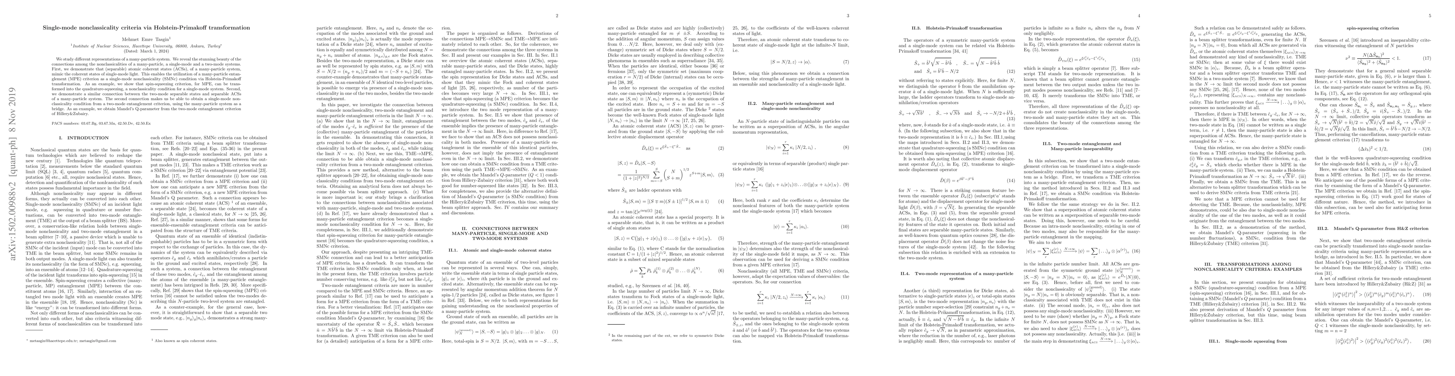 This paper investigates the connections between nonclassicalities in many-particle, single-mode, and two-mode systems using Holstein-Primakoff transformation. It demonstrates how many-particle entanglement criteria can serve as single-mode nonclassicality conditions and shows the transformation of spin-squeezing into quadrature-squeezing. Additionally, it establishes a link between two-mode separable states and many-particle systems to derive single-mode nonclassicality from two-mode entanglement criteria.