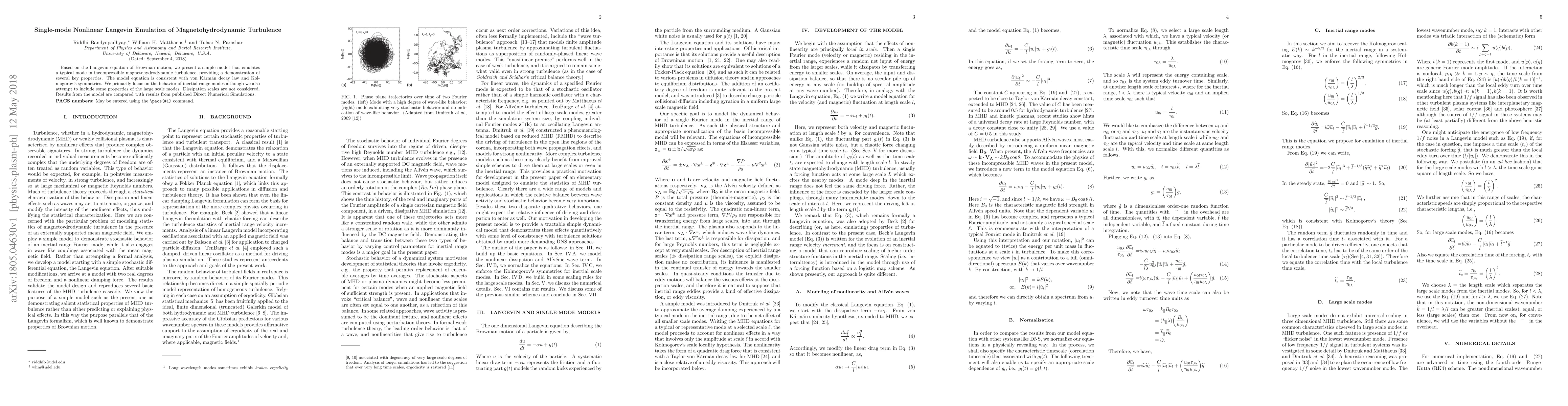 Based on the Langevin equation of Brownian motion, we present a simple model that emulates a typical mode in incompressible magnetohydrodynamic turbulence, providing a demonstration of several key properties. The model equation is consistent with von K\'arm\'an decay law and Kolmogorov's symmetries. We primarily focus on the behavior of inertial range modes although we also attempt to include some properties of the large scale modes. Dissipation scales are not considered. Results from the model are compared with results from published Direct Numerical Simulations.