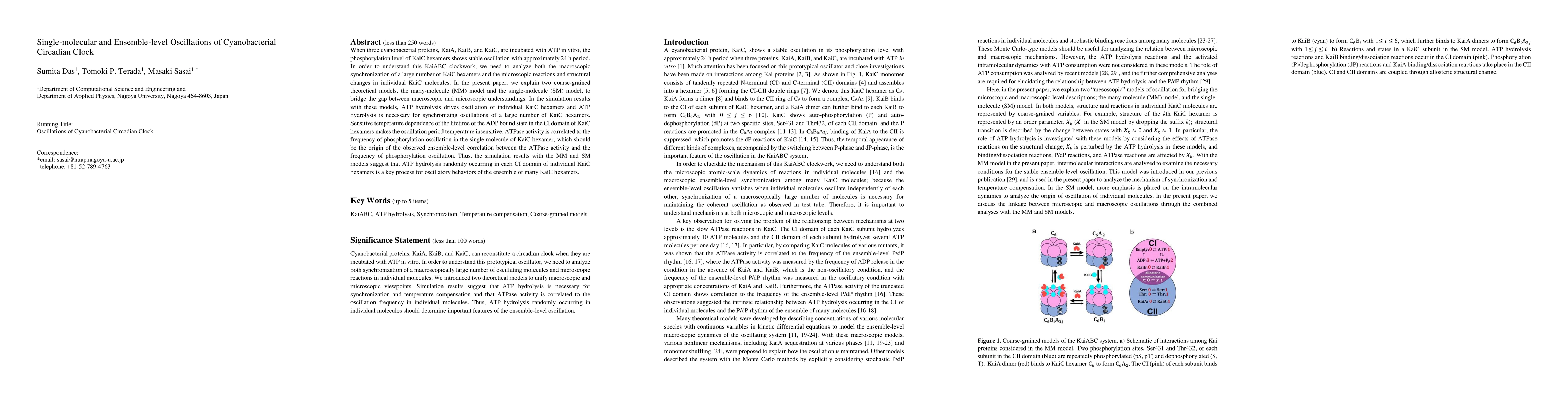 When three cyanobacterial proteins, KaiA, KaiB, and KaiC, are incubated with ATP in vitro, the phosphorylation level of KaiC hexamers shows stable oscillation with approximately 24 h period. In order to understand this KaiABC clockwork, we need to analyze both the macroscopic synchronization of a large number of KaiC hexamers and the microscopic reactions and structural changes in individual KaiC molecules. In the present paper, we explain two coarse-grained theoretical models, the many-molecule (MM) model and the single-molecule (SM) model, to bridge the gap between macroscopic and microscopic understandings. In the simulation results with these models, ATP hydrolysis drives oscillation of individual KaiC hexamers and ATP hydrolysis is necessary for synchronizing oscillations of a large number of KaiC hexamers. Sensitive temperature dependence of the lifetime of the ADP bound state in the CI domain of KaiC hexamers makes the oscillation period temperature insensitive. ATPase activity is correlated to the frequency of phosphorylation oscillation in the single molecule of KaiC hexamer, which should be the origin of the observed ensemble-level correlation between the ATPase activity and the frequency of phosphorylation oscillation. Thus, the simulation results with the MM and SM models suggest that ATP hydrolysis randomly occurring in each CI domain of individual KaiC hexamers is a key process for oscillatory behaviors of the ensemble of many KaiC hexamers.