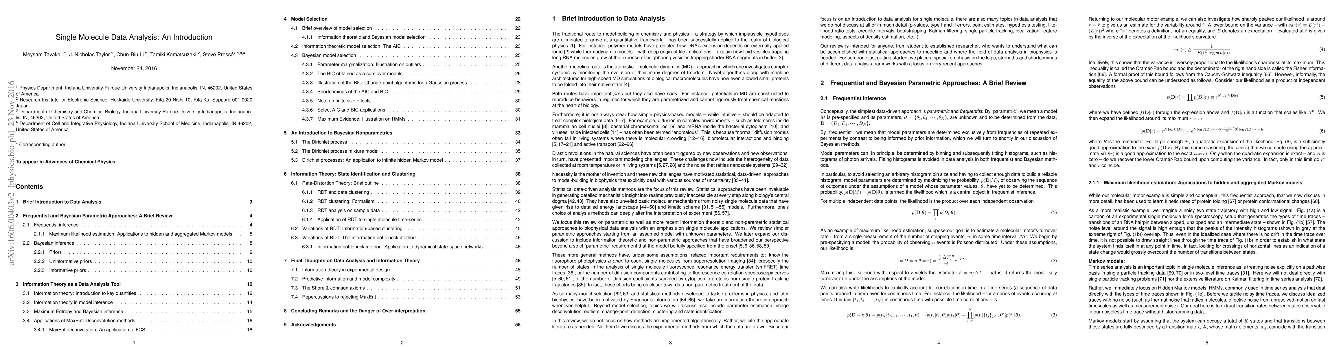 We review methods of data analysis for biophysical data with a special emphasis on single molecule applications. Our review is intended for anyone, from student to established researcher. For someone just getting started, we focus on exposing the logic, strength and limitations of each method and cite, as appropriate, the relevant literature for implementation details. We review traditional frequentist and Bayesian parametric approaches to data analysis and subsequently extend our discussion to recent non-parametric and information theoretic methods.