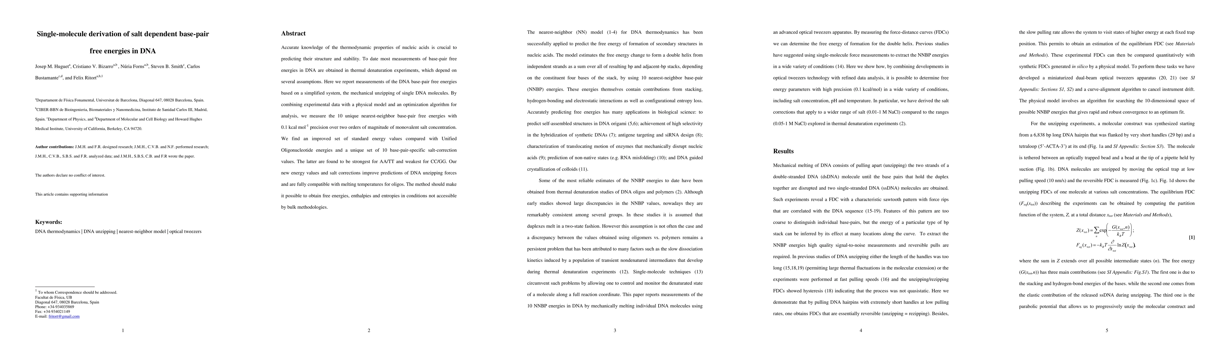 This paper reports precise measurements of DNA base-pair free energies using single-molecule mechanical unzipping, revealing improved standard energy values and salt-correction factors that enhance predictions of DNA stability and unzipping forces. The method provides a novel approach to obtain thermodynamic properties under varied salt conditions.