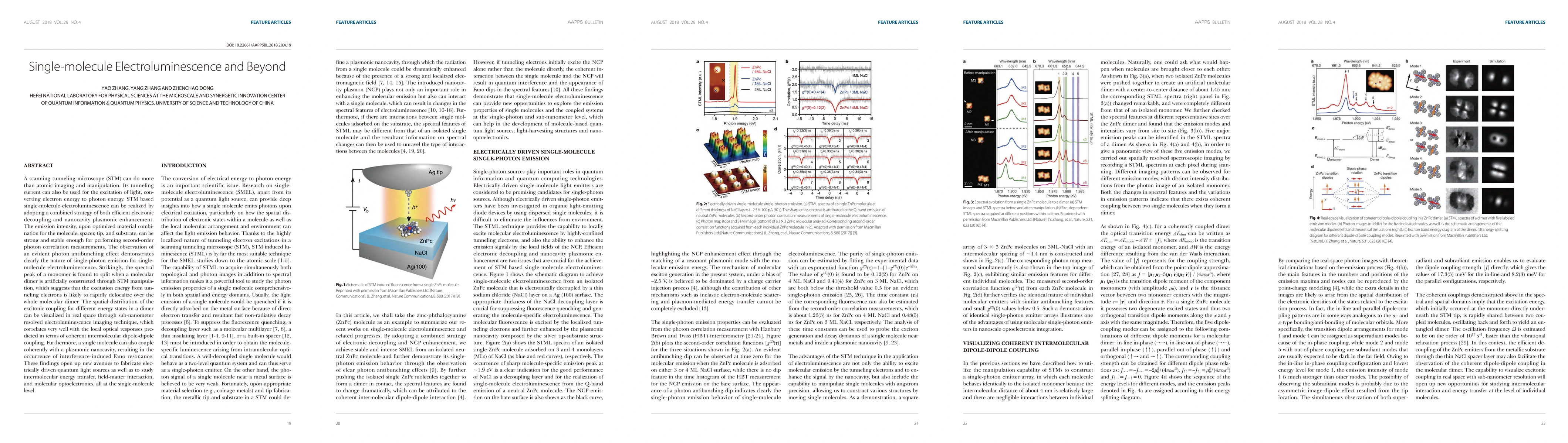 A scanning tunneling microscope (STM) can do more than atomic imaging and manipulation. Its tunneling current can also be used for the excitation of light, converting electron energy to photon energy. STM based single-molecule electroluminescence can be realized by adopting a combined strategy of both efficient electronic decoupling and nanocavity plasmonic enhancement. The emission intensity, upon optimized material combination for the molecule, spacer, tip, and substrate, can be strong and stable enough for performing second-order photon correlation measurements. The observation of an evident photon antibunching effect demonstrates clearly the nature of single-photon emission for single-molecule electroluminescence. Strikingly, the spectral peak of a monomer is found to split when a molecular dimer is artificially constructed through STM manipulation, which suggests that the excitation energy from tunneling electrons is likely to rapidly delocalize over the whole molecular dimer. The spatial distribution of the excitonic coupling for different energy states in a dimer can be visualized in real space through sub-nanometer resolved electroluminescence imaging technique, which correlates very well with the local optical responses predicted in terms of coherent intermolecular dipole-dipole coupling. Furthermore, a single molecule can also couple coherently with a plasmonic nanocavity, resulting in the occurrence of interference-induced Fano resonance. These findings open up new avenues to fabricate electrically driven quantum light sources as well as to study intermolecular energy transfer, field-matter interaction, and molecular optoelectronics, all at the single-molecule level.
