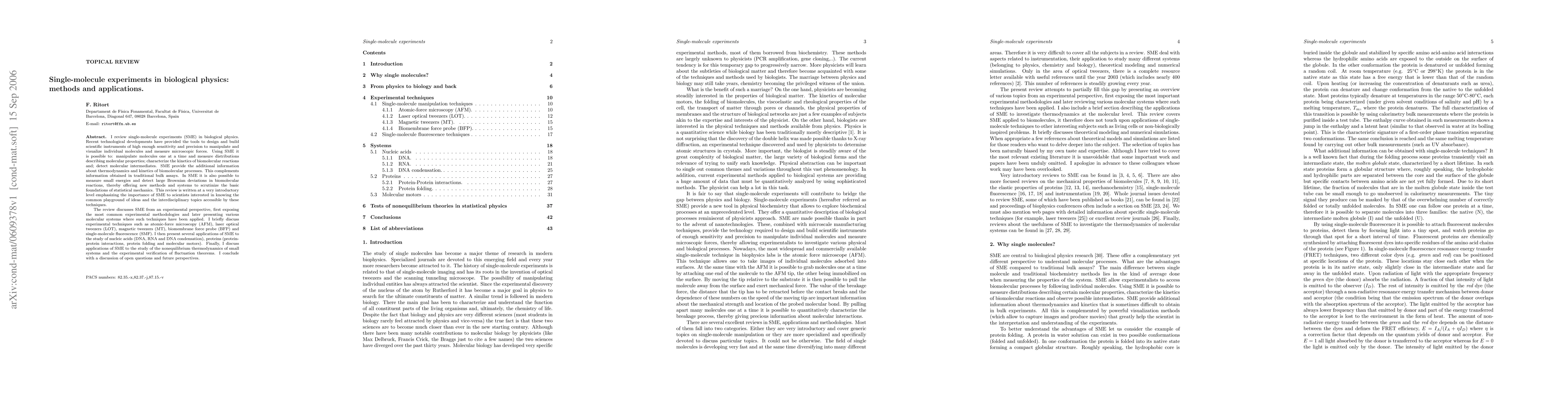 I review single-molecule experiments (SME) in biological physics. Recent technological developments have provided the tools to design and build scientific instruments of high enough sensitivity and precision to manipulate and visualize individual molecules and measure microscopic forces. Using SME it is possible to: manipulate molecules one at a time and measure distributions describing molecular properties; characterize the kinetics of biomolecular reactions and; detect molecular intermediates. SME provide the additional information about thermodynamics and kinetics of biomolecular processes. This complements information obtained in traditional bulk assays. In SME it is also possible to measure small energies and detect large Brownian deviations in biomolecular reactions, thereby offering new methods and systems to scrutinize the basic foundations of statistical mechanics. This review is written at a very introductory level emphasizing the importance of SME to scientists interested in knowing the common playground of ideas and the interdisciplinary topics accessible by these techniques. The review discusses SME from an experimental perspective, first exposing the most common experimental methodologies and later presenting various molecular systems where such techniques have been applied. I briefly discuss experimental techniques such as atomic-force microscopy (AFM), laser optical tweezers (LOT), magnetic tweezers (MT), biomembrane force probe (BFP) and single-molecule fluorescence (SMF). I then present several applications of SME to the study of nucleic acids (DNA, RNA and DNA condensation), proteins (protein-protein interactions, protein folding and molecular motors). Finally, I discuss applications of SME to the study of the nonequilibrium thermodynamics of small systems and the experimental verification of fluctuation theorems. I conclude with a discussion of open questions and future perspectives.