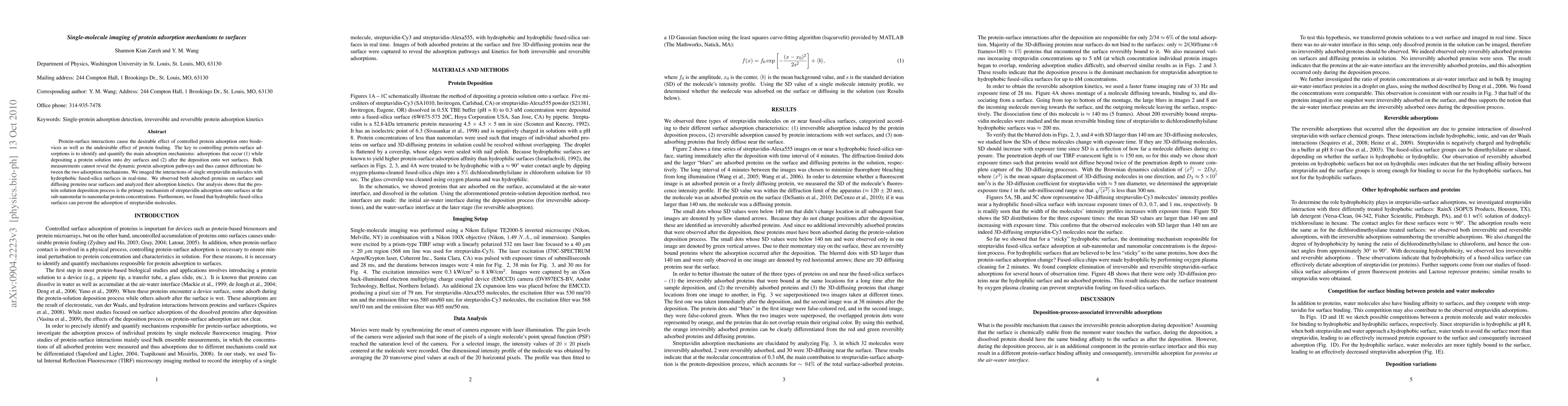 This study employs single-molecule imaging to elucidate the mechanisms of protein adsorption on surfaces, revealing that deposition of protein solutions onto dry surfaces is the primary adsorption mechanism at low concentrations. The research also demonstrates that hydrophilic surfaces can inhibit streptavidin adsorption.