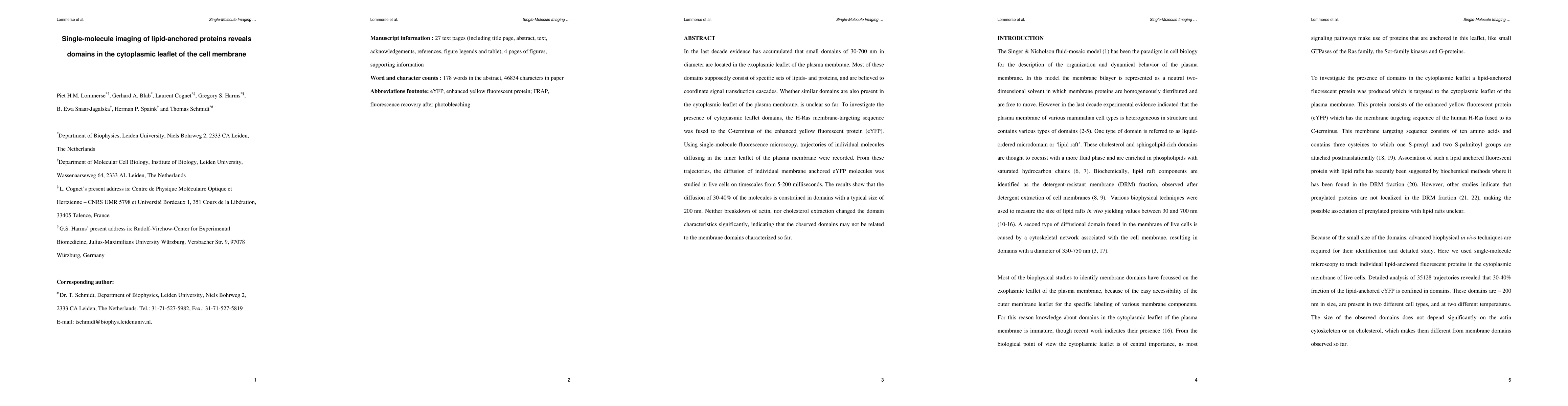 This study uses single-molecule fluorescence microscopy to investigate the presence of domains in the cytoplasmic leaflet of the plasma membrane, revealing that 30-40% of H-Ras membrane-anchor molecules diffuse in constrained domains of approximately 200 nm, independent of actin or cholesterol.