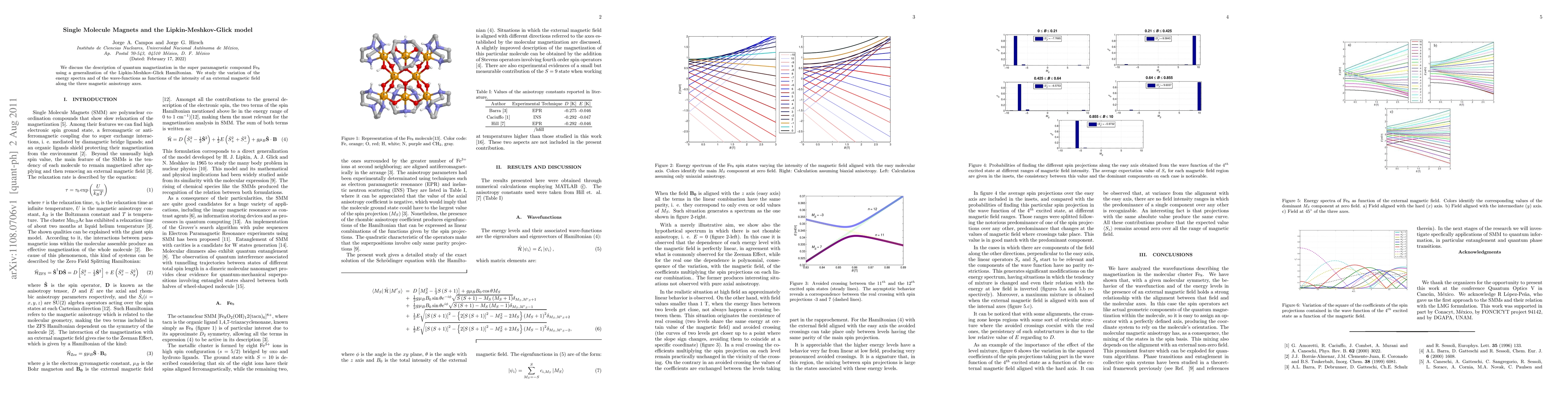We discuss the description of quantum magnetization in the super paramagnetic compound Fe$_8$ using a generalization of the Lipkin-Meshkov-Glick Hamiltonian. We study the variation of the energy spectra and of the wave-functions as functions of the intensity of an external magnetic field along the three magnetic anisotropy axes.