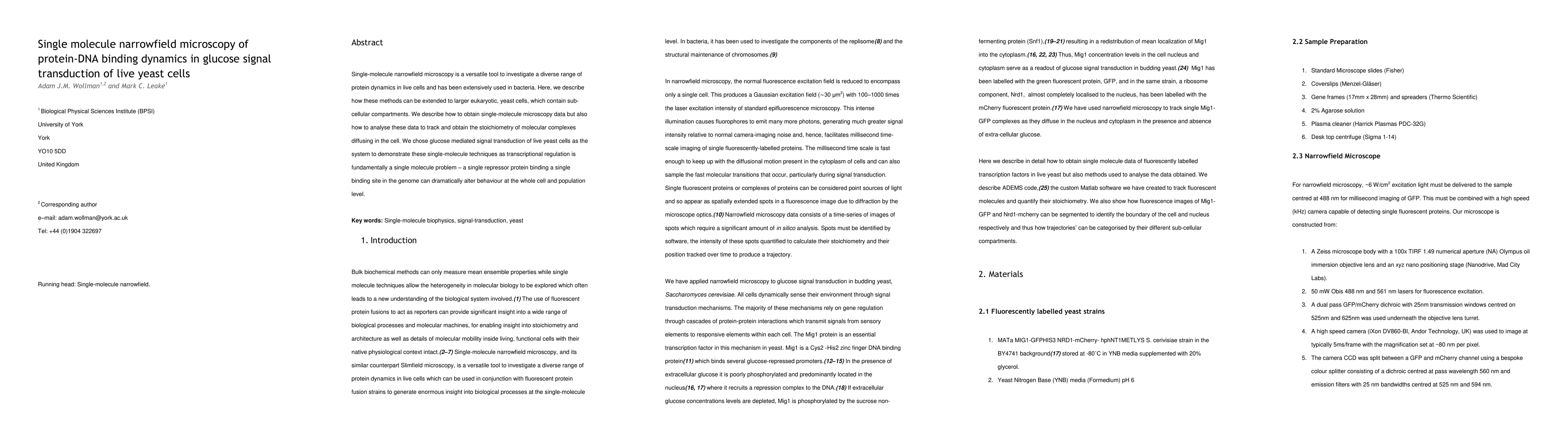 This paper explores the application of single-molecule narrowfield microscopy to study protein-DNA binding dynamics in glucose signal transduction within live yeast cells, demonstrating the technique's utility in eukaryotic cells and providing a method for analyzing data to determine molecular complex stoichiometry. The focus on glucose-mediated signal transduction highlights the significance of single-molecule interactions in transcriptional regulation.