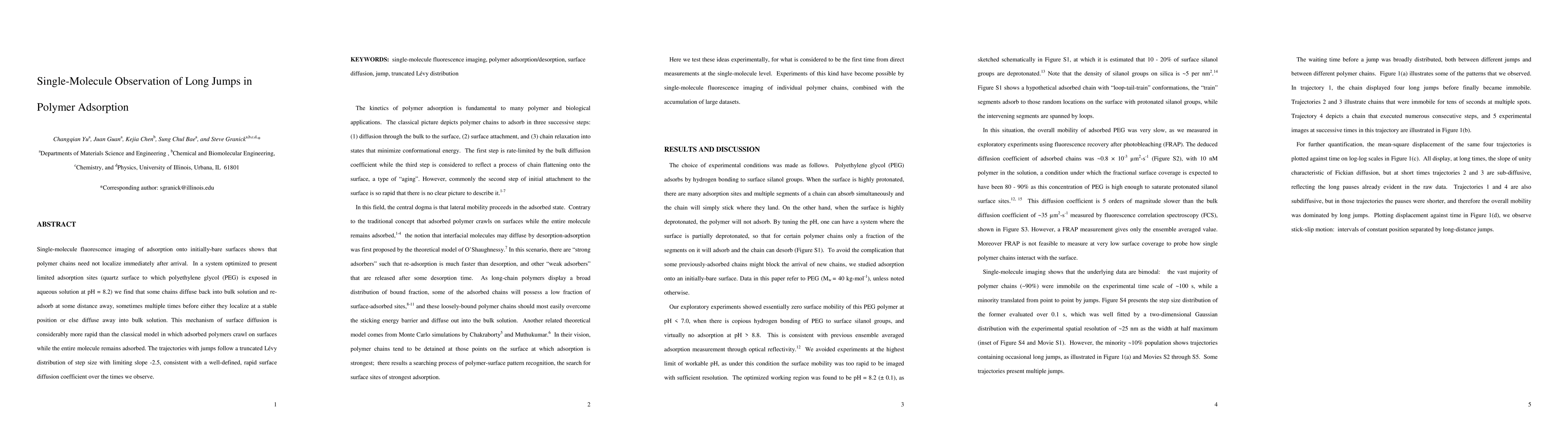 Single-molecule fluorescence imaging of adsorption onto initially-bare surfaces shows that polymer chains need not localize immediately after arrival. In a system optimized to present limited adsorption sites (quartz surface to which polyethylene glycol (PEG) is exposed in aqueous solution at pH = 8.2) we find that some chains diffuse back into bulk solution and re-adsorb at some distance away, sometimes multiple times before either they localize at a stable position or else diffuse away into bulk solution. This mechanism of surface diffusion is considerably more rapid than the classical model in which adsorbed polymers crawl on surfaces while the entire molecule remains adsorbed. The trajectories with jumps follow a truncated Levy distribution of step size with limiting slope -2.5, consistent with a well-defined, rapid surface diffusion coefficient over the times we observe.