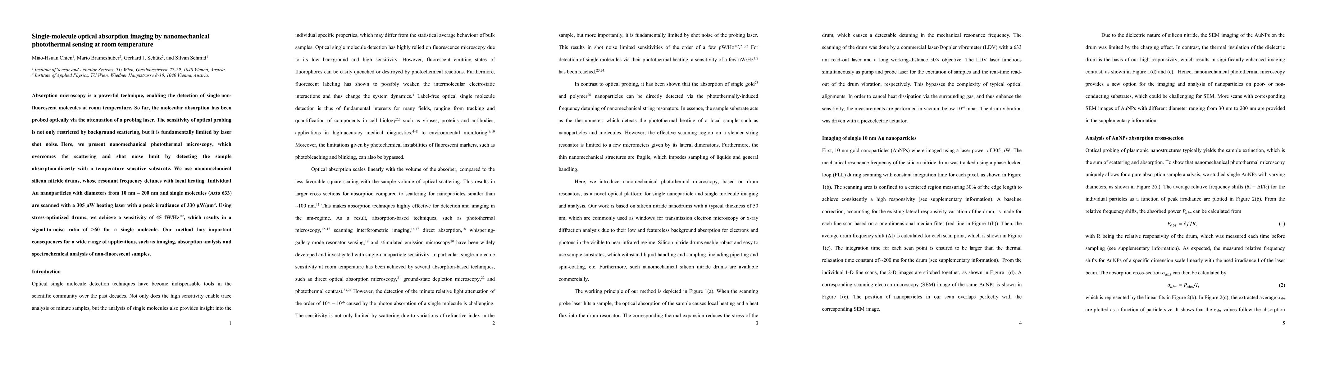This paper introduces a novel nanomechanical photothermal microscopy technique that detects single non-fluorescent molecules by measuring local heating with resonant silicon nitride drums, achieving a sensitivity that surpasses optical probing limitations. The method provides a signal-to-noise ratio of >60 for single molecules, with implications for imaging and absorption analysis.