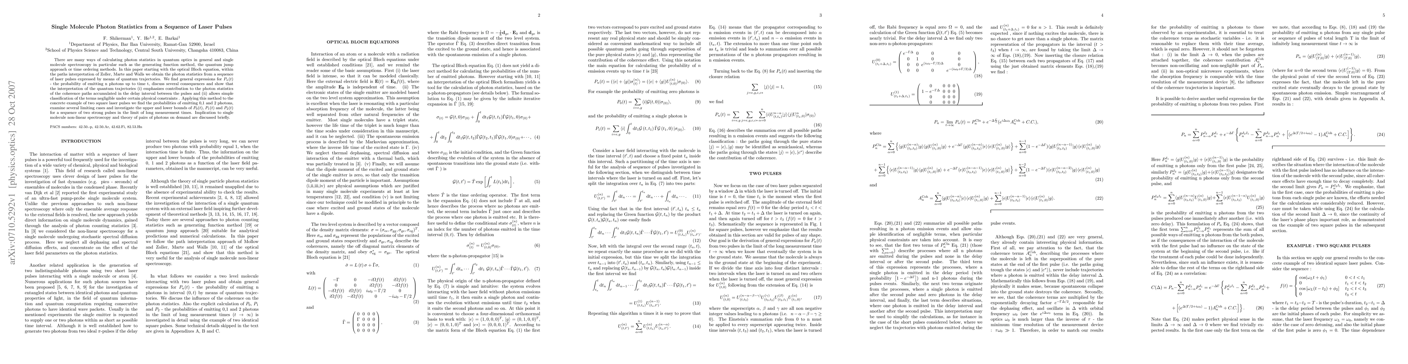 This paper derives photon statistics from a sequence of laser pulses using quantum trajectories based on the optical Bloch equation. It highlights the significance of coherence paths and simplifies the classification of negligible terms, providing specific probabilities for emitting 0, 1, and 2 photons in the case of two square pulses.