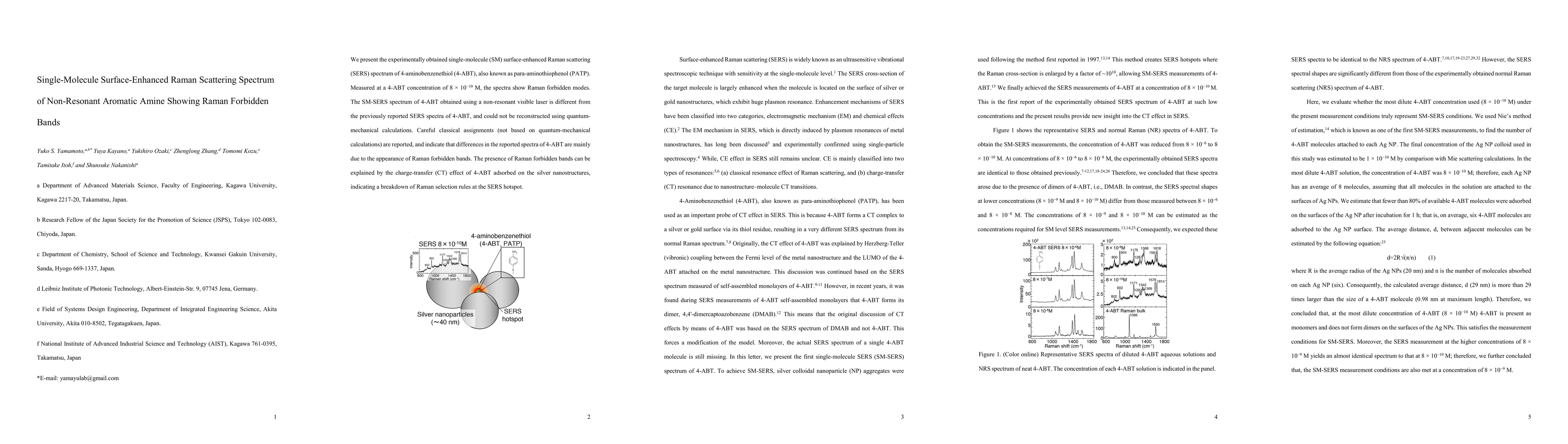 This study presents the single-molecule SERS spectrum of 4-aminibenzenethiol, revealing Raman forbidden bands, which differ from prior reports and cannot be explained by quantum mechanical calculations. The appearance of these bands is attributed to charge-transfer effects at SERS hotspots, indicating a breakdown of Raman selection rules.