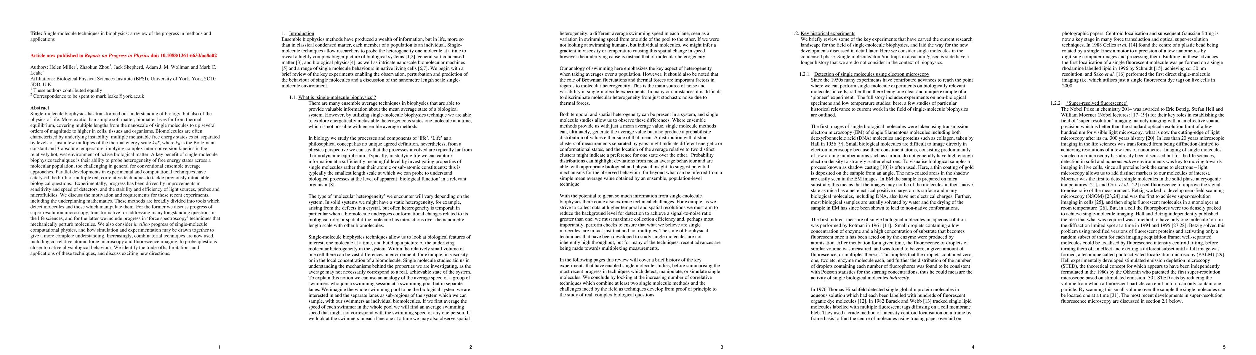 Single-molecule biophysics has transformed our understanding of the fundamental molecular processes involved in living biological systems, but also of the fascinating physics of life. Far more exotic than a collection of exemplars of soft matter behaviour, active biological matter lives far from thermal equilibrium, and typically covers multiple length scales from the nanometre level of single molecules up several orders of magnitude to longer length scales in emergent structures of cells, tissues and organisms. Biological molecules are often characterized by an underlying instability, in that multiple metastable free energy states exist which are separated by energy levels of typically just a few multiples of the thermal energy scale of kBT, where kB is the Boltzmann constant and T the absolute temperature, implying complex, dynamic inter-conversion kinetics across this bumpy free energy landscape in the relatively hot, wet environment of real, living biological matter. The key utility of single-molecule biophysics lies in its ability to probe the underlying heterogeneity of free energy states across a population of molecules, which in general is too challenging for conventional ensemble level approaches which measure mean average properties. Parallel developments in both experimental and theoretical techniques have been key to the latest insights and are enabling the development of highly-multiplexed, correlative techniques to tackle previously intractable biological problems. Experimentally, technological developments in the sensitivity and speed of biomolecular detectors, the stability and efficiency of light sources, probes and microfluidics, have enabled and driven the study of heterogeneous behaviours both in vitro and in vivo that were previously undetectable by ensemble methods...