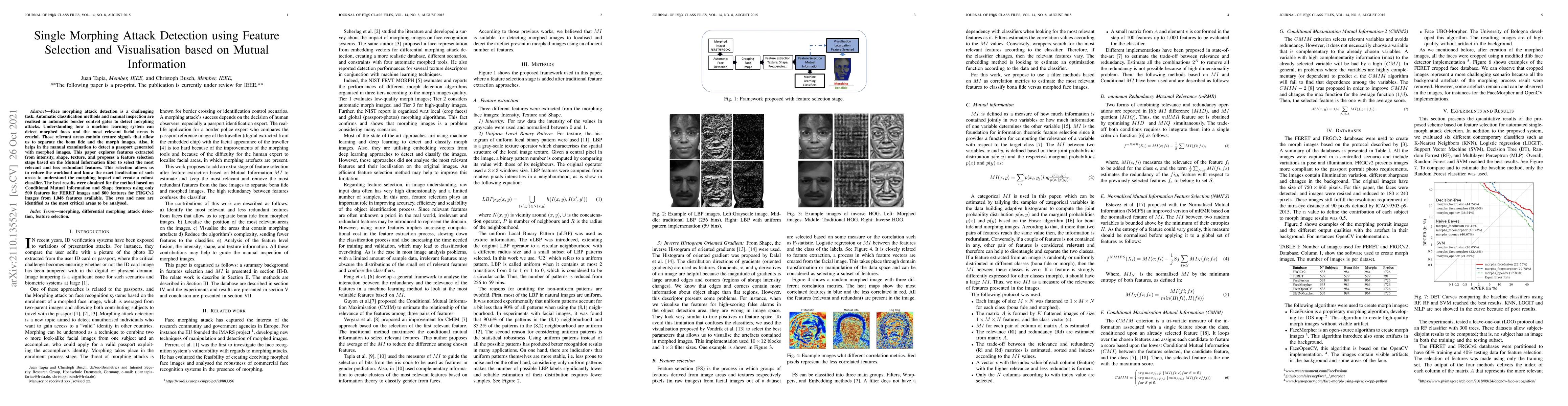 This paper proposes a method for detecting face morphing attacks using feature selection based on Mutual Information, focusing on intensity, shape, and texture features. The most critical areas identified for analysis are the eyes and nose, which help in creating a robust classifier and reducing computational workload.