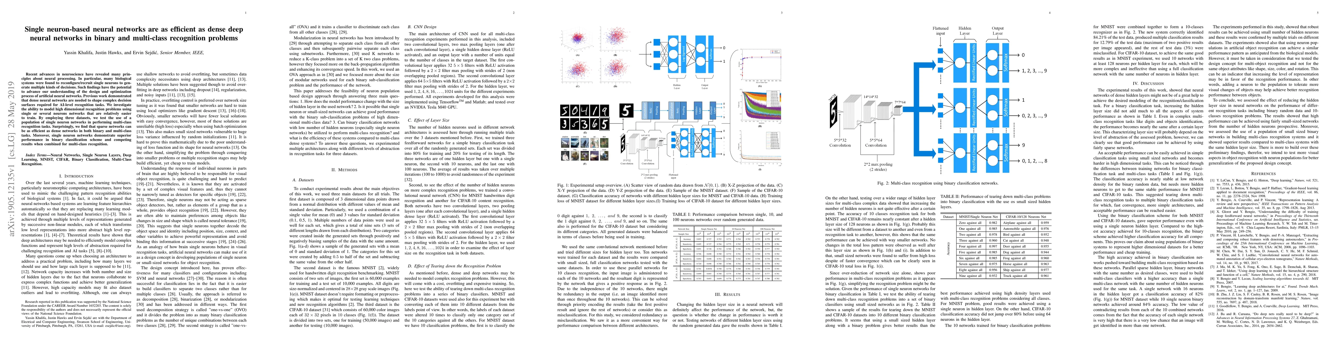 Recent advances in neuroscience have revealed many principles about neural processing. In particular, many biological systems were found to reconfigure/recruit single neurons to generate multiple kinds of decisions. Such findings have the potential to advance our understanding of the design and optimization process of artificial neural networks. Previous work demonstrated that dense neural networks are needed to shape complex decision surfaces required for AI-level recognition tasks. We investigate the ability to model high dimensional recognition problems using single or several neurons networks that are relatively easier to train. By employing three datasets, we test the use of a population of single neuron networks in performing multi-class recognition tasks. Surprisingly, we find that sparse networks can be as efficient as dense networks in both binary and multi-class tasks. Moreover, single neuron networks demonstrate superior performance in binary classification scheme and competing results when combined for multi-class recognition.
