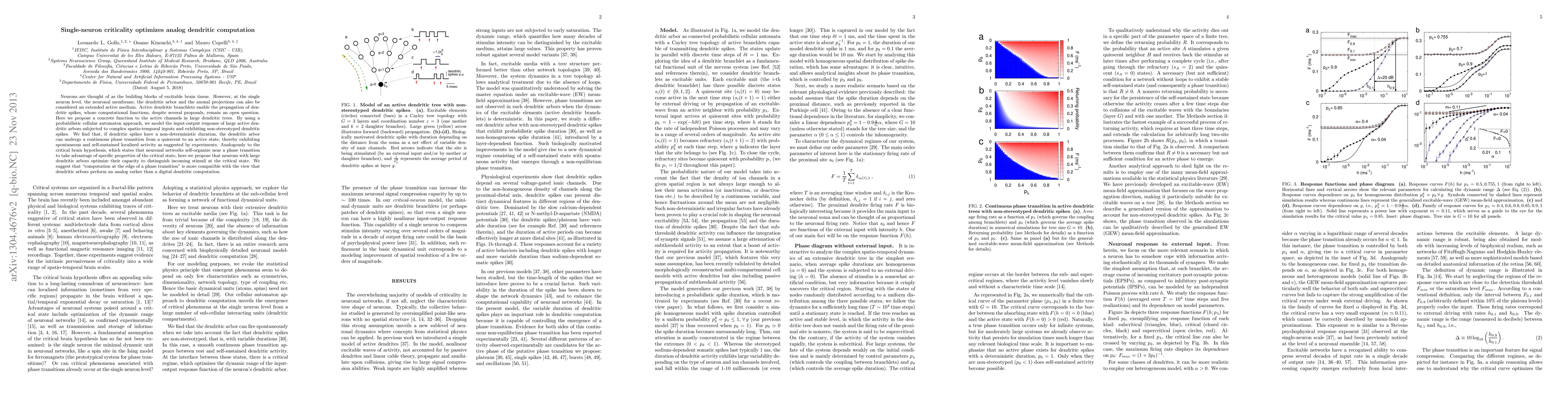 This paper proposes that neurons optimize their ability to distinguish stimuli by operating at the critical state of dendritic spikes, suggesting a continuous phase transition in dendritic computation. It argues that this critical state supports analog computation in large dendritic arbors, aligning with the critical brain hypothesis.