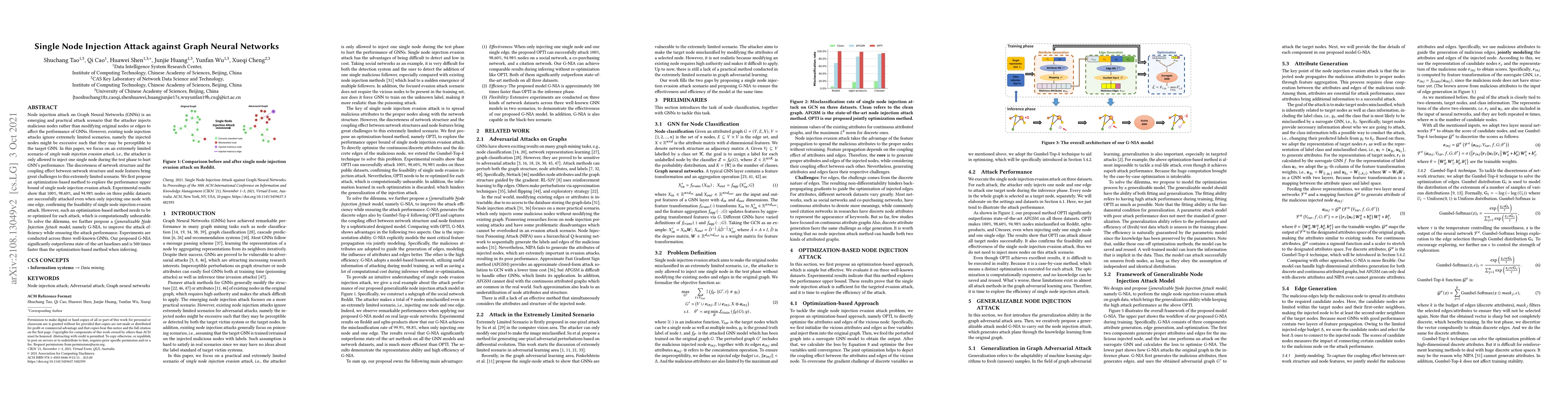 This paper investigates the single node injection attack on Graph Neural Networks (GNNs), focusing on the challenge of injecting just one node to degrade GNN performance. The authors propose an optimization-based method to maximize attack success and demonstrate its effectiveness across three datasets. To address computational limitations, they introduce G-NIA, a generalizable model that significantly enhances attack efficiency while maintaining performance, outperforming existing methods by 500 times during inference.