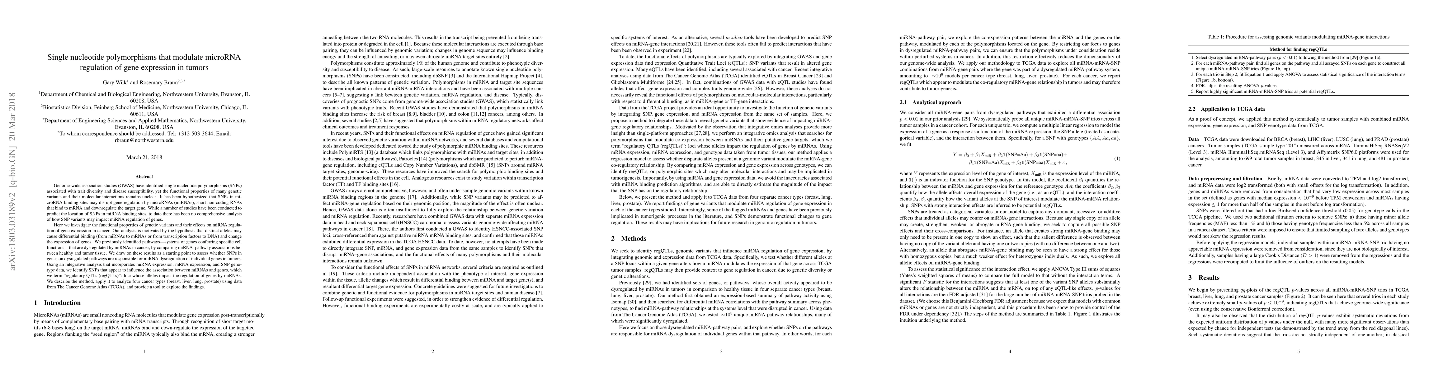 This paper investigates how single nucleotide polymorphisms (SNPs) in microRNA binding sites affect gene regulation in cancer, identifying "regulatory QTLs" that modulate miRNA regulation of gene expression. Using data from The Cancer Genome Atlas (TCGA), the authors analyze four cancer types to determine the impact of SNPs on miRNA-mediated dysregulation of genes in dysregulated pathways.