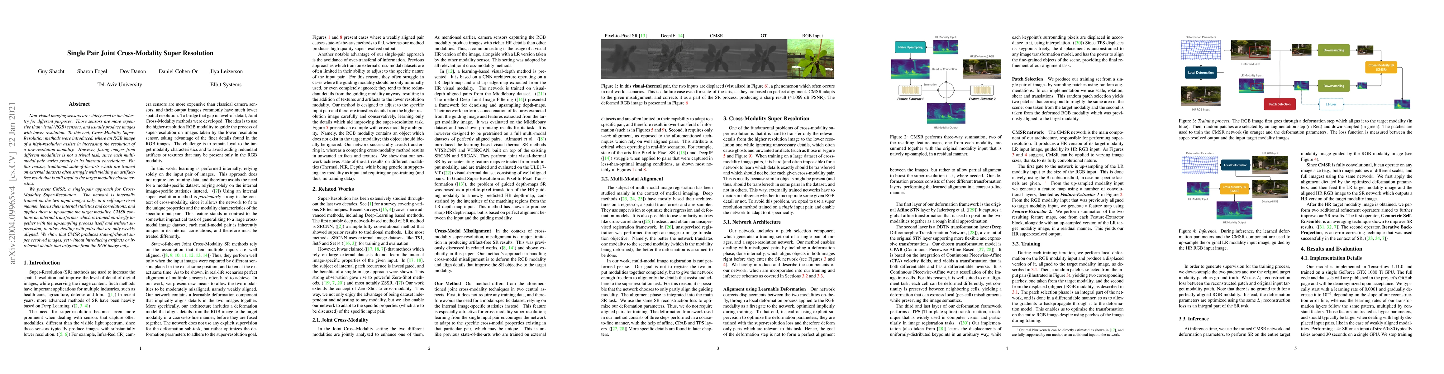 Non-visual imaging sensors are widely used in the industry for different purposes. Those sensors are more expensive than visual (RGB) sensors, and usually produce images with lower resolution. To this end, Cross-Modality Super-Resolution methods were introduced, where an RGB image of a high-resolution assists in increasing the resolution of the low-resolution modality. However, fusing images from different modalities is not a trivial task; the output must be artifact-free and remain loyal to the characteristics of the target modality. Moreover, the input images are never perfectly aligned, which results in further artifacts during the fusion process. We present CMSR, a deep network for Cross-Modality Super-Resolution, which unlike previous methods, is designed to deal with weakly aligned images. The network is trained on the two input images only, learns their internal statistics and correlations, and applies them to up-sample the target modality. CMSR contains an internal transformer that is trained on-the-fly together with the up-sampling process itself, without explicit supervision. We show that CMSR succeeds to increase the resolution of the input image, gaining valuable information from its RGB counterpart, yet in a conservative way, without introducing artifacts or irrelevant details.