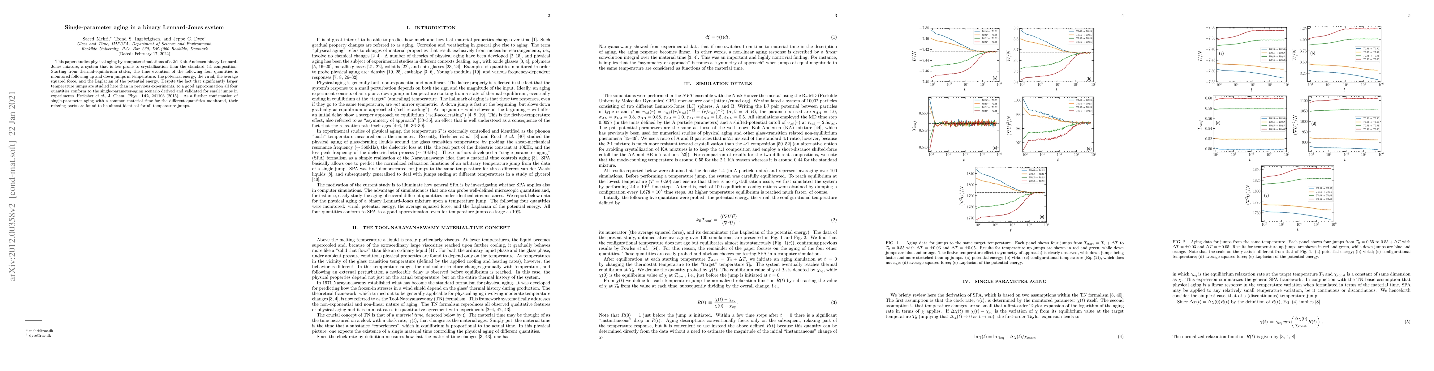 This paper investigates physical aging in a 2:1 Kob-Andersen binary Lennard-Jones system via computer simulations, finding that key quantities conform to the single-parameter-aging model even after significant temperature jumps, confirming the model's robustness across different scales.
