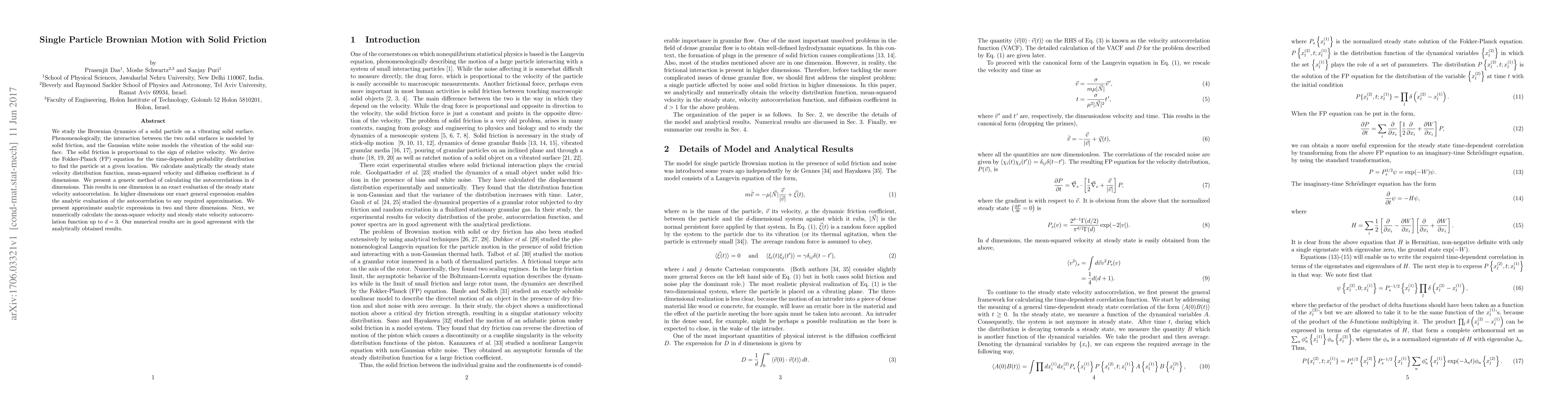 We study the Brownian dynamics of a solid particle on a vibrating solid surface. Phenomenologically, the interaction between the two solid surfaces is modeled by solid friction, and the Gaussian white noise models the vibration of the solid surface. The solid friction is proportional to the sign of relative velocity. We derive the Fokker-Planck (FP) equation for the time-dependent probability distribution to find the particle at a given location. We calculate analytically the steady state velocity distribution function, mean-squared velocity and diffusion coefficient in $d$ dimensions. We present a generic method of calculating the autocorrelations in $d$ dimensions. This results in one dimension in an exact evaluation of the steady state velocity autocorrelation. In higher dimensions, our exact general expression enables the analytic evaluation of the autocorrelation to any required approximation. We present approximate analytic expressions in two and three dimensions. Next, we numerically calculate the mean-square velocity and steady state velocity autocorrelation function up to $d=3$. Our numerical results are in good agreement with the analytically obtained results.