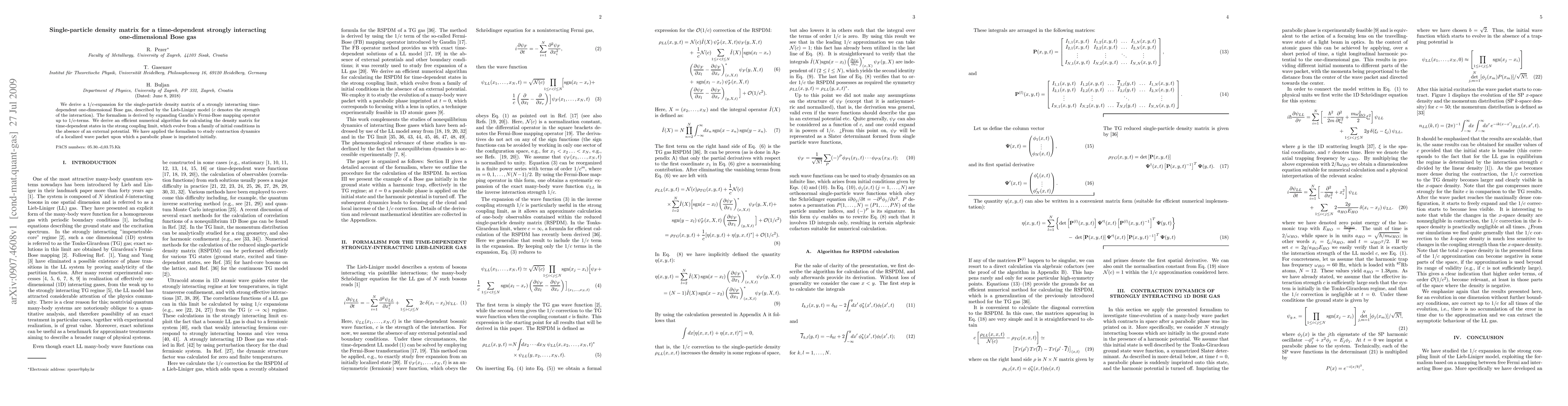 This paper derives a $1/c$-expansion for the single-particle density matrix of a strongly interacting time-dependent one-dimensional Bose gas using the Lieb-Liniger model. It presents an efficient numerical algorithm for calculating this density matrix in the strong coupling limit and applies the formalism to study the contraction dynamics of a localized wave packet with an initial parabolic phase.