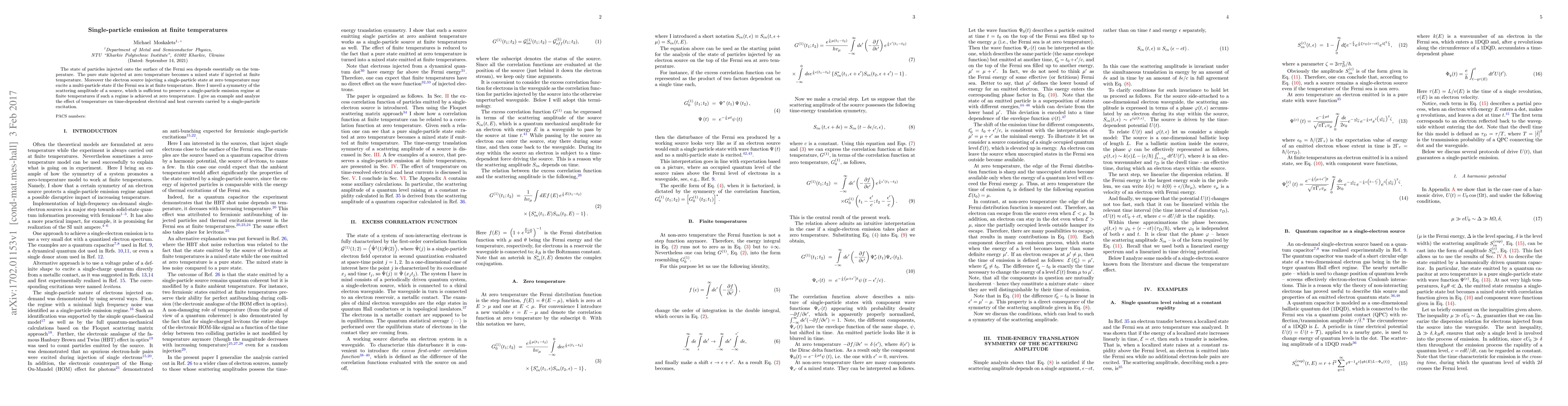 This paper explores how single-particle emission dynamics change with temperature, revealing that a pure state at zero temperature becomes mixed at finite temperature, and a single-particle source may excite multi-particle states. It identifies a symmetry in scattering amplitudes that maintains single-particle emission at finite temperatures if it exists at zero temperature, and examines the impact of temperature on time-dependent electrical and heat currents.