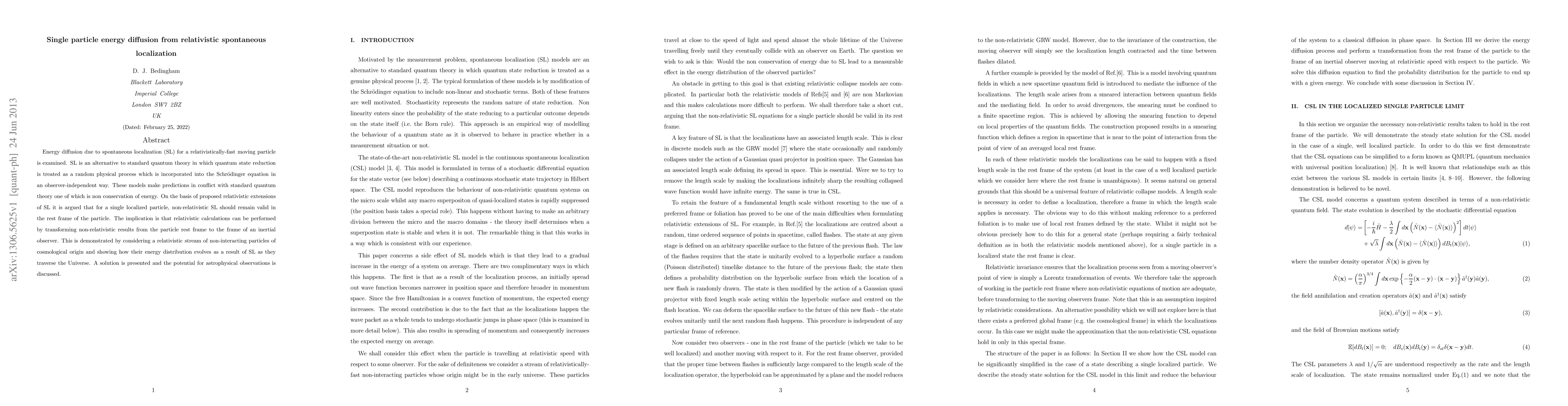 This paper examines energy diffusion in relativistic particles through spontaneous localization, a theory that proposes quantum state reduction as a random physical process. It argues that non-relativistic SL remains valid in the rest frame of relativistic particles, allowing for relativistic calculations by transforming non-relativistic results, and discusses the implications for astrophysical observations.