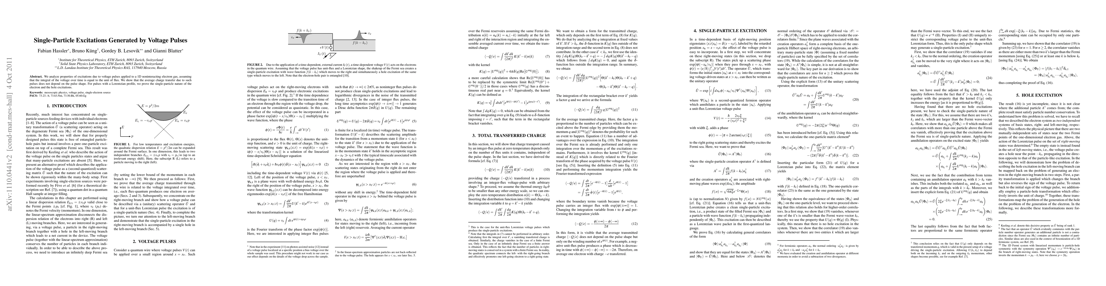 We analyze properties of excitations due to voltage pulses applied to a 1D noninteracting electron gas, assuming that the integral of the voltage over time is equal to the unit of flux. We show that the average charge transfer due to such pulses does not depend on the pulse shape. For pulses with a Lorentzian profile, we prove the single-particle nature of the electron and the hole excitations.