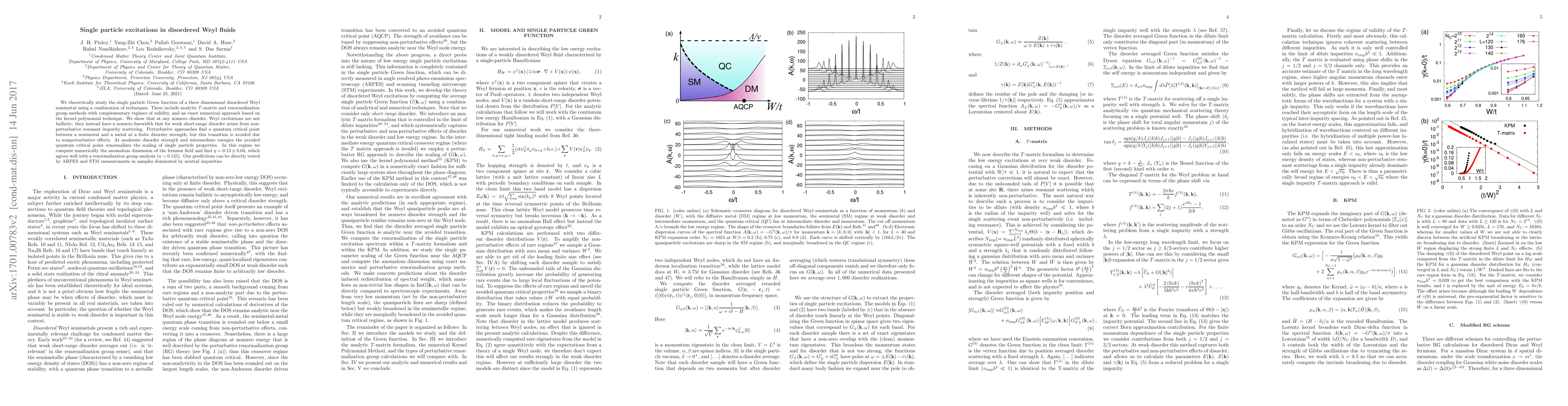 We theoretically study the single particle Green function of a three dimensional disordered Weyl semimetal using a combination of techniques. These include analytic $T$-matrix and renormalization group methods with complementary regimes of validity, and an exact numerical approach based on the kernel polynomial technique. We show that at any nonzero disorder, Weyl excitations are not ballistic: they instead have a nonzero linewidth that for weak short-range disorder arises from non-perturbative resonant impurity scattering. Perturbative approaches find a quantum critical point between a semimetal and a metal at a finite disorder strength, but this transition is avoided due to nonperturbative effects. At moderate disorder strength and intermediate energies the avoided quantum critical point renormalizes the scaling of single particle properties. In this regime we compute numerically the anomalous dimension of the fermion field and find $\eta= 0.13 \pm 0.04$, which agrees well with a renormalization group analysis ($\eta= 0.125$). Our predictions can be directly tested by ARPES and STM measurements in samples dominated by neutral impurities.