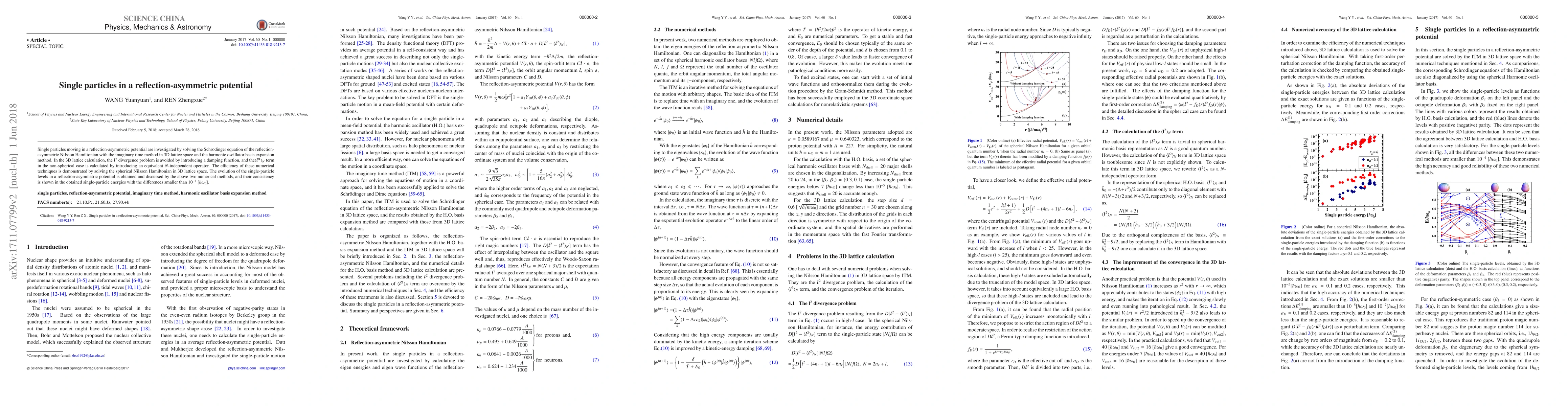 Single particles moving in a reflection-asymmetric potential are investigated by solving the Schr\"{o}dinger equation of the reflection-asymmetric Nilsson Hamiltonian with the imaginary time method in 3D lattice space and the harmonic oscillator basis expansion method. In the 3D lattice calculation, the $\bm{l}^2$ divergence problem is avoided by introducing a damping function, and the$\langle \bm{l^2}\rangle_N$ term in the non-spherical case is calculated by introducing an equivalent $N$-independent operator. The efficiency of these numerical techniques is demonstrated by solving the spherical Nilsson Hamiltonian in 3D lattice space. The evolution of the single-particle levels in a reflection-asymmetric potential is obtained and discussed by the above two numerical methods, and their consistency is shown in the obtained single-particle energies with the differences smaller than 10$^{-4}~[\hbar\omega_0]$.
