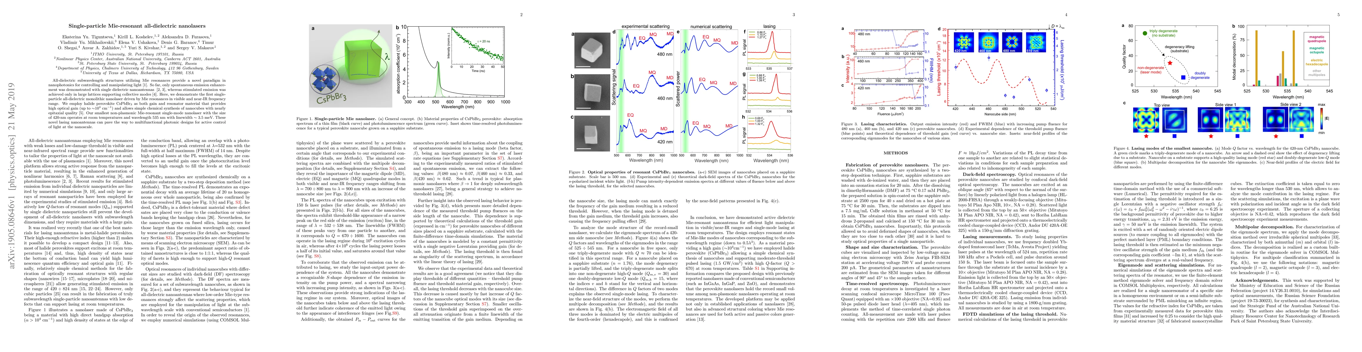 This paper demonstrates the first single-particle all-dielectric monolithic nanolaser driven by Mie resonances, using halide perovskite CsPbBr$_3$ for both gain and resonator material. The smallest non-plasmonic Mie-resonant nanolaser operates at room temperature with a wavelength of 535 nm, showcasing potential for nanoscale photonic designs.