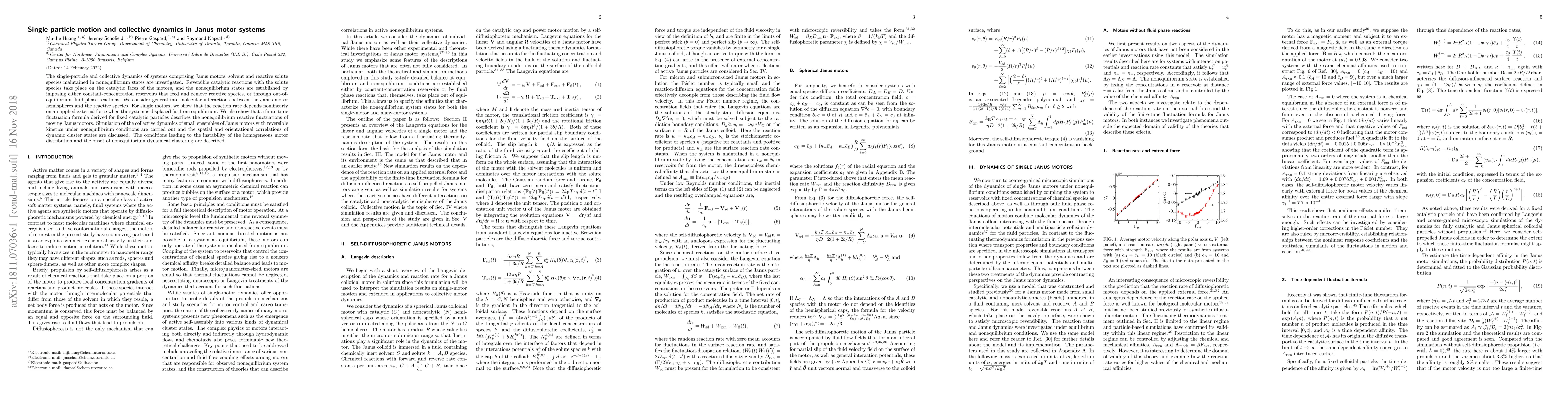 This paper investigates the single-particle and collective dynamics of Janus motor systems under nonequilibrium conditions, revealing nonlinear dependence of reaction rates on external forces and describing the nonequilibrium fluctuations of moving Janus motors. It also explores the instability and clustering behavior of motor ensembles, leading to nonequilibrium dynamical clustering.