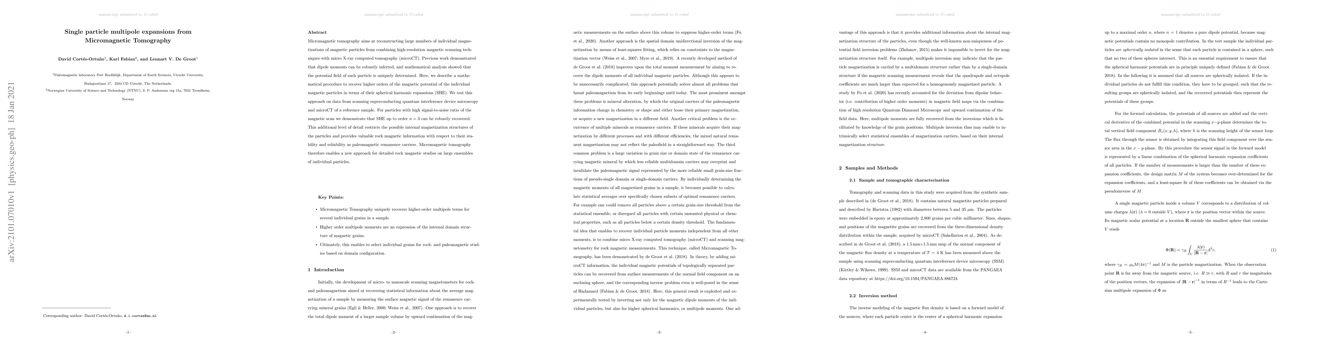 Researchers developed a method to analyze the internal structure of magnetic particles using micromagnetic tomography, allowing for more detailed rock magnetic studies on individual particles. They successfully recovered higher-order expansions of magnetic potential, revealing new insights into particle stability and reliability as paleomagnetic carriers.