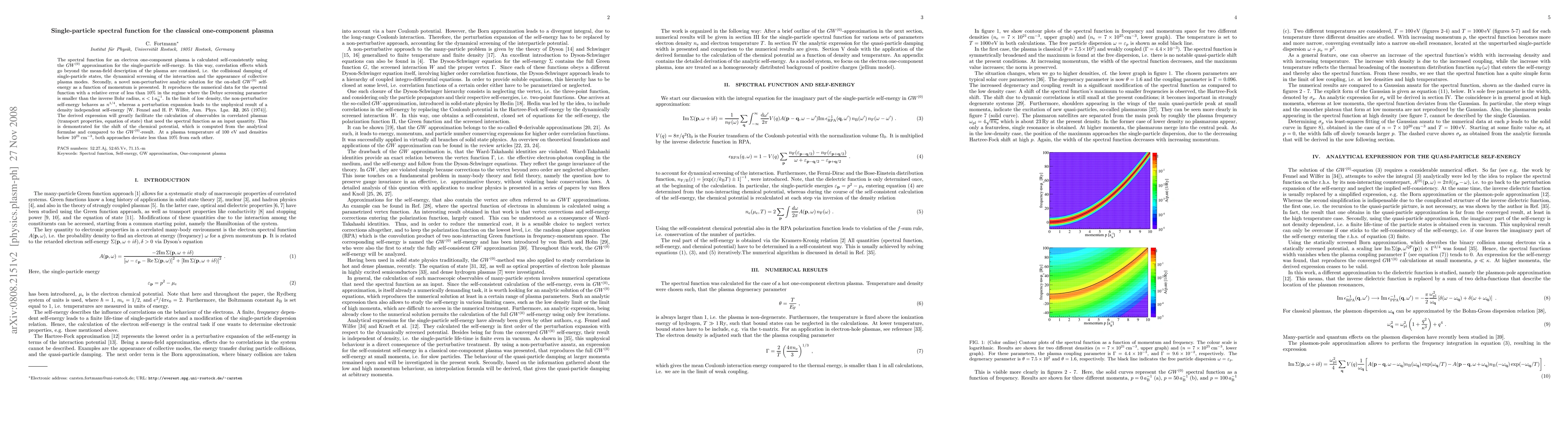 The spectral function for an electron one-component plasma is calculated self-consistently using the GW0 approximation for the single-particle self-energy. In this way, correlation effects which go beyond the mean-field description of the plasma are contained, i.e. the collisional damping of single-particle states, the dynamical screening of the interaction and the appearance of collective plasma modes. Secondly, a novel non-perturbative analytic solution for the on-shell GW0 self-energy as a function of momentum is presented. It reproduces the numerical data for the spectral function with a relative error of less than 10% in the regime where the Debye screening parameter is smaller than the inverse Bohr radius, kappa<1/a_B. In the limit of low density, the non-perturbative self-energy behaves as n^(1/4), whereas a perturbation expansion leads to the unphysical result of a density independent self-energy [W. Fennel and H. P. Wilfer, Ann. Phys. Lpz._32_, 265 (1974)]. The derived expression will greatly facilitate the calculation of observables in correlated plasmas (transport properties, equation of state) that need the spectral function as an input quantity. This is demonstrated for the shift of the chemical potential, which is computed from the analytical formulae and compared to the GW0-result. At a plasma temperature of 100 eV and densities below 10^21 cm^-3, both approaches deviate less than 10% from each other.