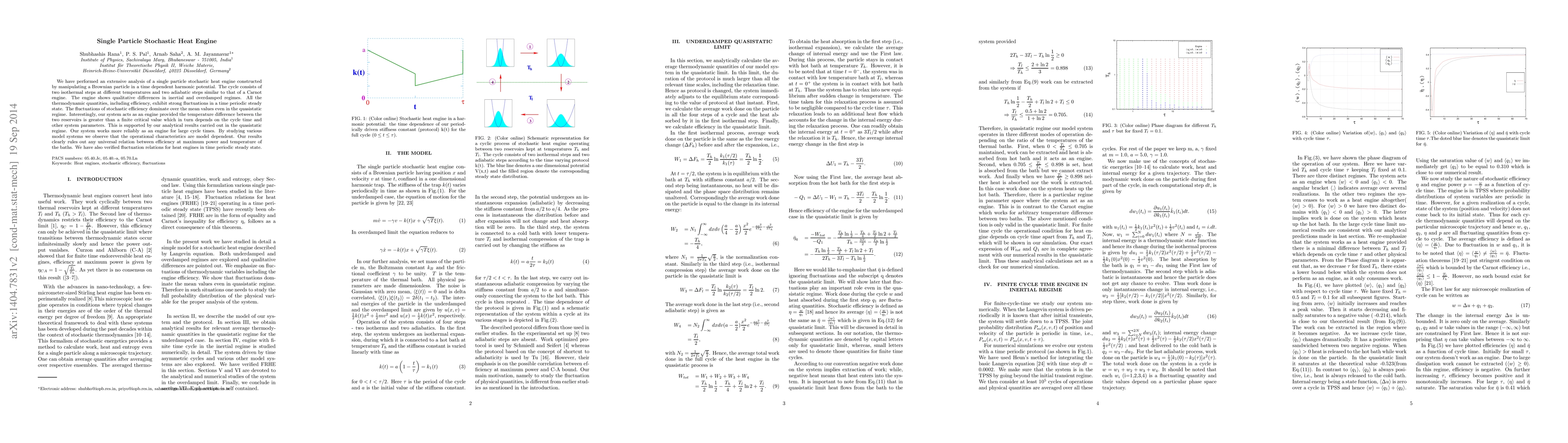 This paper investigates a single particle stochastic heat engine operating in a time-dependent harmonic potential, revealing significant fluctuations in thermodynamic quantities and efficiency, especially in the quasistatic regime. The engine's performance depends on the temperature difference between reservoirs and cycle time, with larger cycles enhancing reliability.