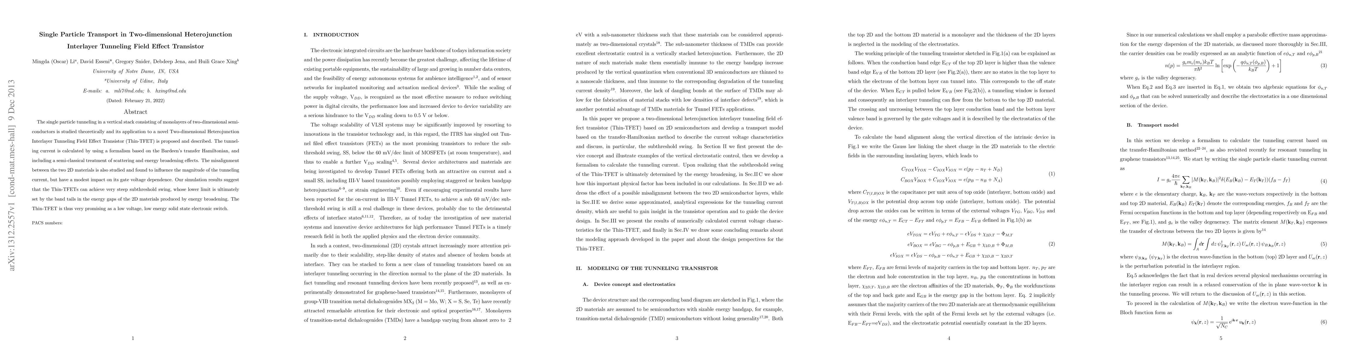 This paper investigates single particle tunneling in vertical stacks of monolayer 2D semiconductors for a novel Two-dimensional Heterojunction Interlayer Tunneling Field Effect Transistor (Thin-TFET), finding that it can achieve a steep subthreshold swing and promising low voltage, low energy operation. The study also examines the impact of misalignment between 2D materials on tunneling current.