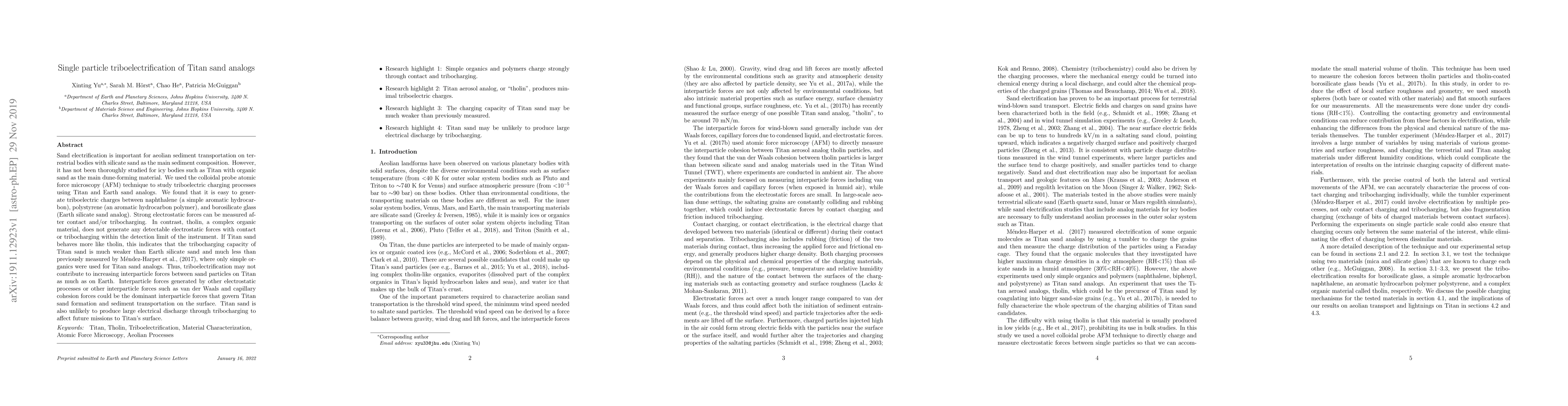 This work contrasts with previous studies by examining the triboelectric charging of complex organic materials like tholin, suggesting that triboelectric effects on Titan may be weaker than previously expected, potentially less significant than van der Waals forces in governing sand dynamics.