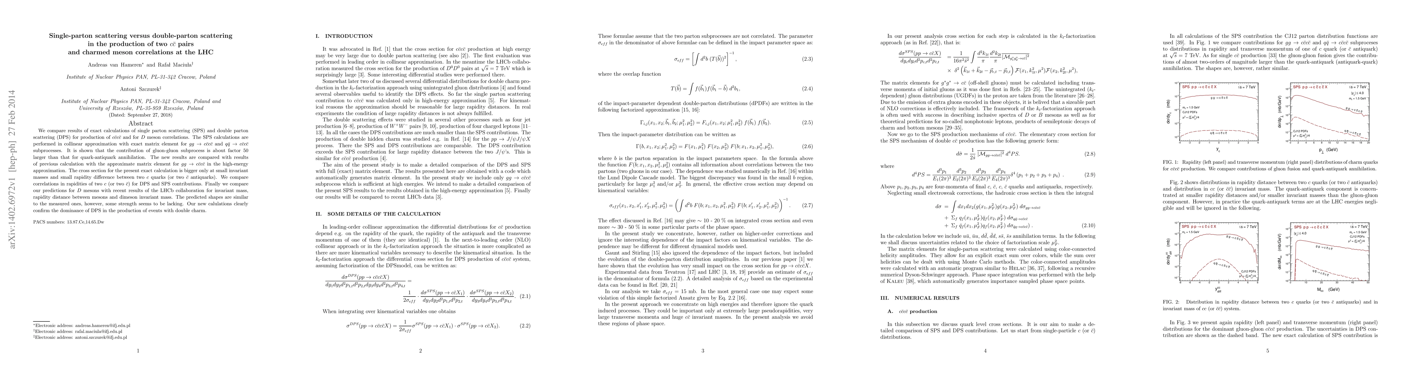 We compare results of exact calculations of single parton scattering (SPS) and double parton scattering (DPS) for production of $c \bar c c \bar c$ and for $D$ meson correlations. The SPS calculations are performed in collinear approximation with exact matrix element for $g g \to c \bar c c \bar c$ and $q \bar q \to c \bar c c \bar c$ subprocesses. It is shown that the contribution of gluon-gluon subprocess is about factor 50 larger than that for quark-antiquark annihilation. The new results are compared with results of previous calculation with the approximate matrix element for $g g \to c \bar c c \bar c$ in the high-energy approximation. The cross section for the present exact calculation is bigger only at small invariant masses and small rapidity difference between two $c$ quarks (or two $\bar c$ antiquarks). We compare correlations in rapidities of two $c$ (or two $\bar c$) for DPS and SPS contributions. Finally we compare our predictions for $D$ mesons with recent results of the LHCb collaboration for invariant mass, rapidity distance between mesons and dimeson invariant mass. The predicted shapes are similar to the measured ones, however, some strength seems to be lacking. Our new calulations clearly confirm the dominance of DPS in the production of events with double charm.