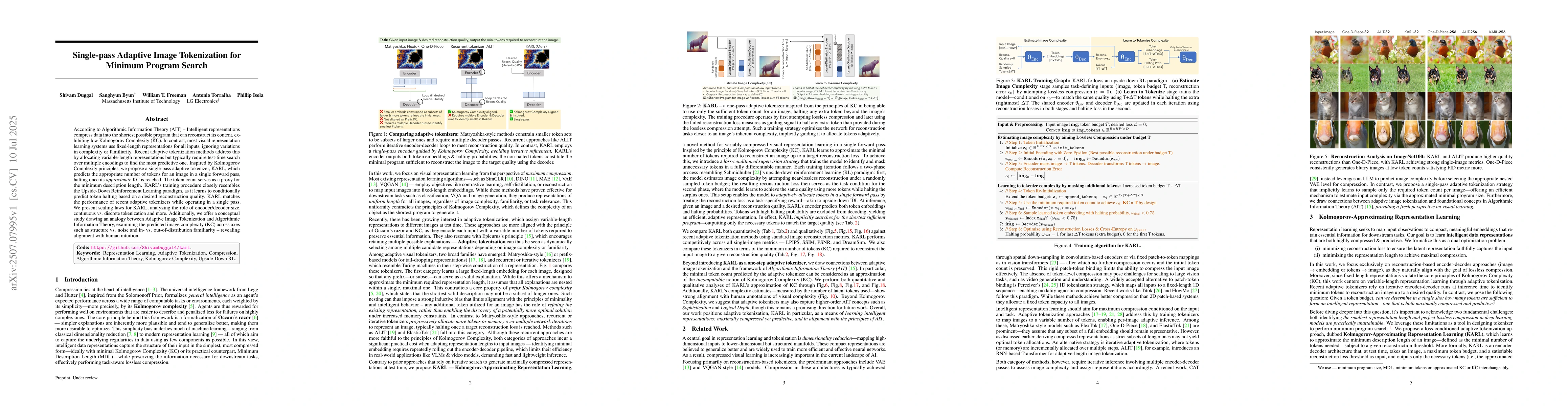 According to Algorithmic Information Theory (AIT) -- Intelligent representations compress data into the shortest possible program that can reconstruct its content, exhibiting low Kolmogorov Complexity (KC). In contrast, most visual representation learning systems use fixed-length representations for all inputs, ignoring variations in complexity or familiarity. Recent adaptive tokenization methods address this by allocating variable-length representations but typically require test-time search over multiple encodings to find the most predictive one. Inspired by Kolmogorov Complexity principles, we propose a single-pass adaptive tokenizer, KARL, which predicts the appropriate number of tokens for an image in a single forward pass, halting once its approximate KC is reached. The token count serves as a proxy for the minimum description length. KARL's training procedure closely resembles the Upside-Down Reinforcement Learning paradigm, as it learns to conditionally predict token halting based on a desired reconstruction quality. KARL matches the performance of recent adaptive tokenizers while operating in a single pass. We present scaling laws for KARL, analyzing the role of encoder/decoder size, continuous vs. discrete tokenization and more. Additionally, we offer a conceptual study drawing an analogy between Adaptive Image Tokenization and Algorithmic Information Theory, examining the predicted image complexity (KC) across axes such as structure vs. noise and in- vs. out-of-distribution familiarity -- revealing alignment with human intuition.