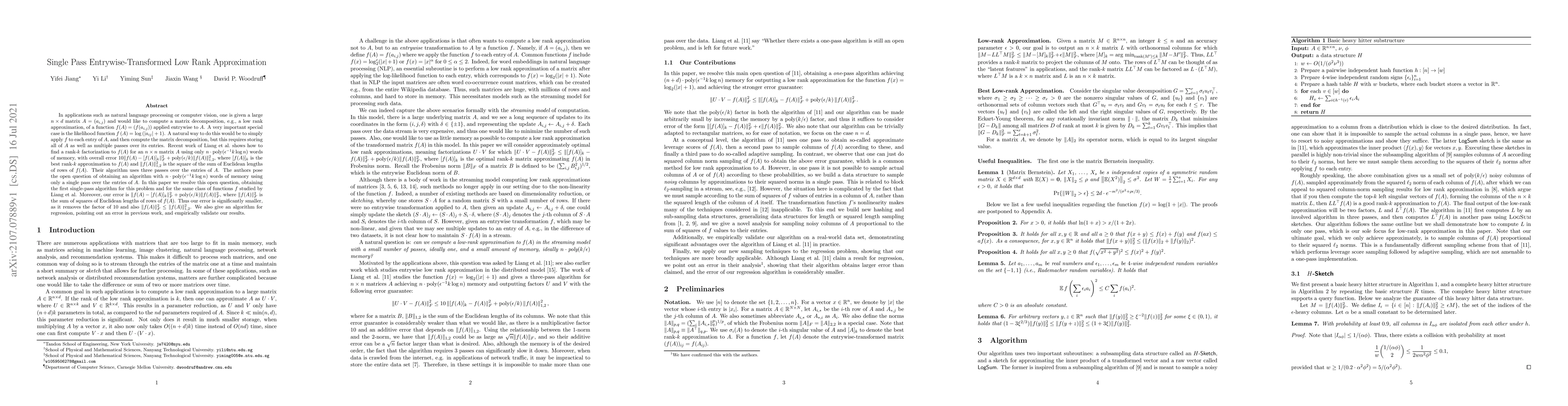 In applications such as natural language processing or computer vision, one is given a large $n \times d$ matrix $A = (a_{i,j})$ and would like to compute a matrix decomposition, e.g., a low rank approximation, of a function $f(A) = (f(a_{i,j}))$ applied entrywise to $A$. A very important special case is the likelihood function $f\left( A \right ) = \log{\left( \left| a_{ij}\right| +1\right)}$. A natural way to do this would be to simply apply $f$ to each entry of $A$, and then compute the matrix decomposition, but this requires storing all of $A$ as well as multiple passes over its entries. Recent work of Liang et al.\ shows how to find a rank-$k$ factorization to $f(A)$ for an $n \times n$ matrix $A$ using only $n \cdot \operatorname{poly}(\epsilon^{-1}k\log n)$ words of memory, with overall error $10\|f(A)-[f(A)]_k\|_F^2 + \operatorname{poly}(\epsilon/k) \|f(A)\|_{1,2}^2$, where $[f(A)]_k$ is the best rank-$k$ approximation to $f(A)$ and $\|f(A)\|_{1,2}^2$ is the square of the sum of Euclidean lengths of rows of $f(A)$. Their algorithm uses three passes over the entries of $A$. The authors pose the open question of obtaining an algorithm with $n \cdot \operatorname{poly}(\epsilon^{-1}k\log n)$ words of memory using only a single pass over the entries of $A$. In this paper we resolve this open question, obtaining the first single-pass algorithm for this problem and for the same class of functions $f$ studied by Liang et al. Moreover, our error is $\|f(A)-[f(A)]_k\|_F^2 + \operatorname{poly}(\epsilon/k) \|f(A)\|_F^2$, where $\|f(A)\|_F^2$ is the sum of squares of Euclidean lengths of rows of $f(A)$. Thus our error is significantly smaller, as it removes the factor of $10$ and also $\|f(A)\|_F^2 \leq \|f(A)\|_{1,2}^2$. We also give an algorithm for regression, pointing out an error in previous work, and empirically validate our results.
