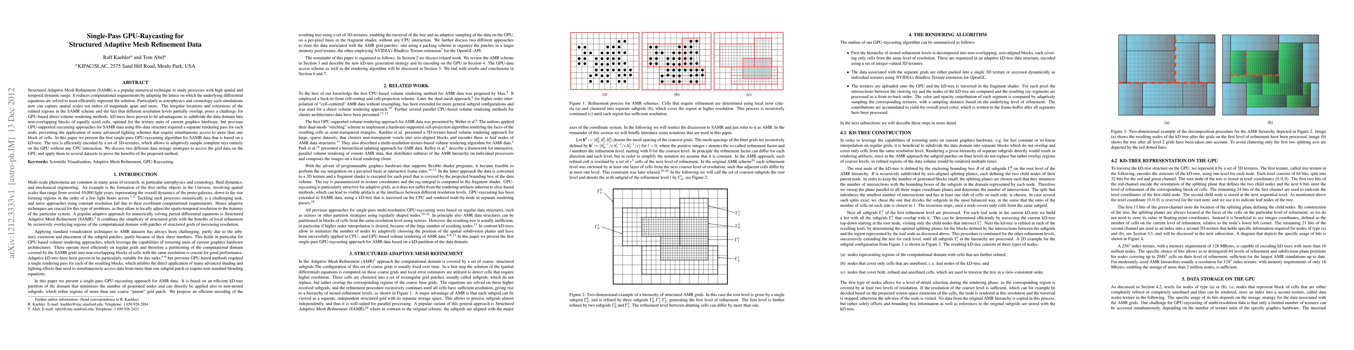 This paper introduces a single-pass GPU-raycasting algorithm for rendering Structured Adaptive Mesh Refinement (SAMR) data using kD-trees encoded in 3D-textures, enabling adaptive sampling on the GPU without CPU interaction. The method efficiently handles overlapping refined regions and supports advanced lighting schemes.
