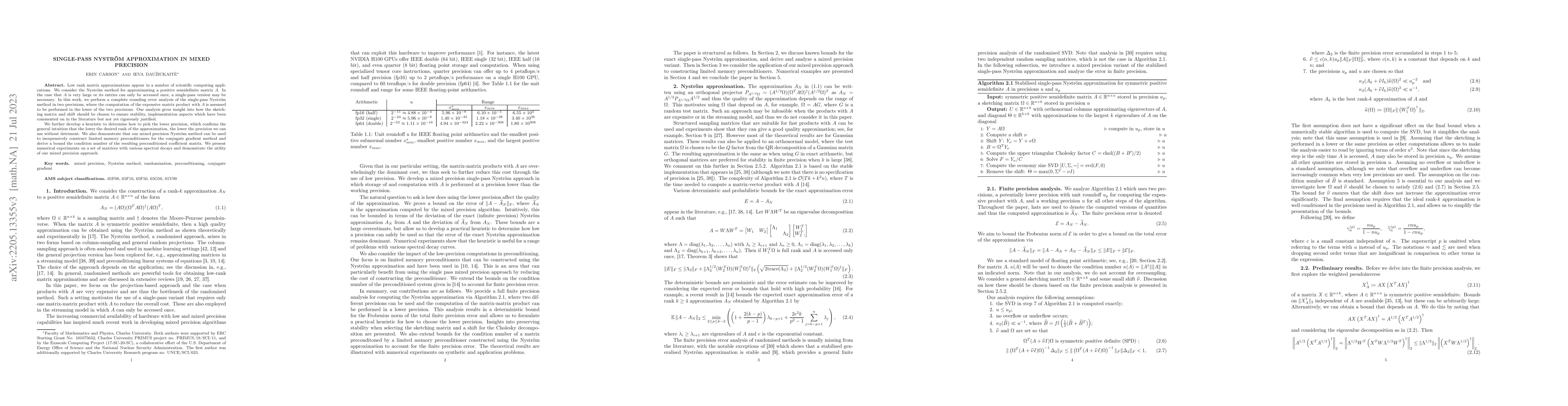 This paper investigates the single-pass Nyström method for low-rank matrix approximations in mixed precision, providing a rounding error analysis and heuristics for selecting precision levels. It demonstrates the method's utility for constructing limited memory preconditioners and presents numerical results validating its effectiveness.