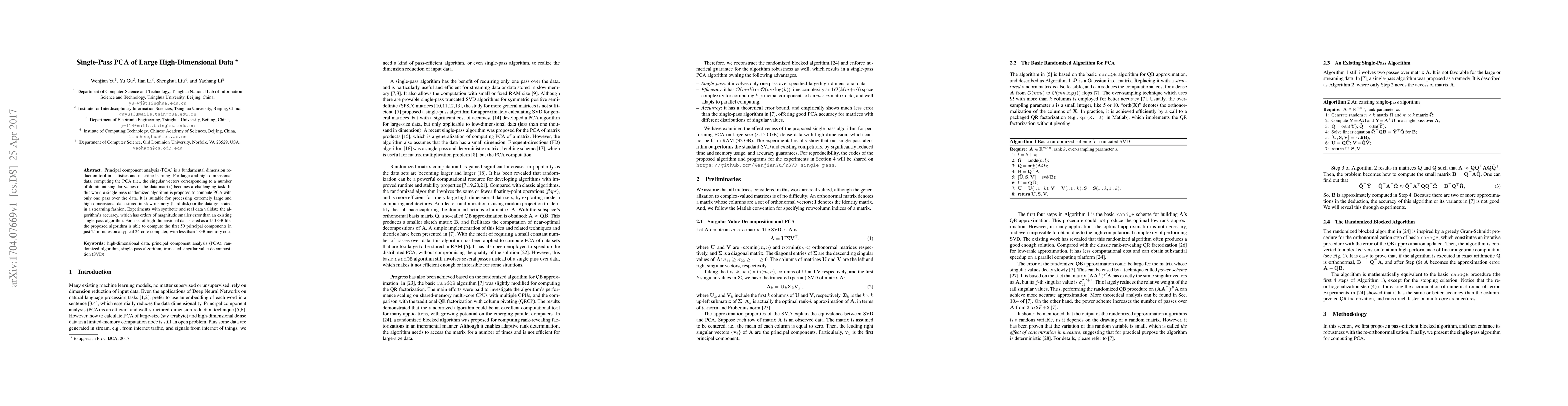 This paper proposes a single-pass randomized algorithm for efficient PCA computation on large, high-dimensional datasets, achieving significantly lower error compared to existing methods and demonstrating its effectiveness on a 150 GB dataset. The algorithm computes the first 50 principal components in 24 minutes using minimal memory.