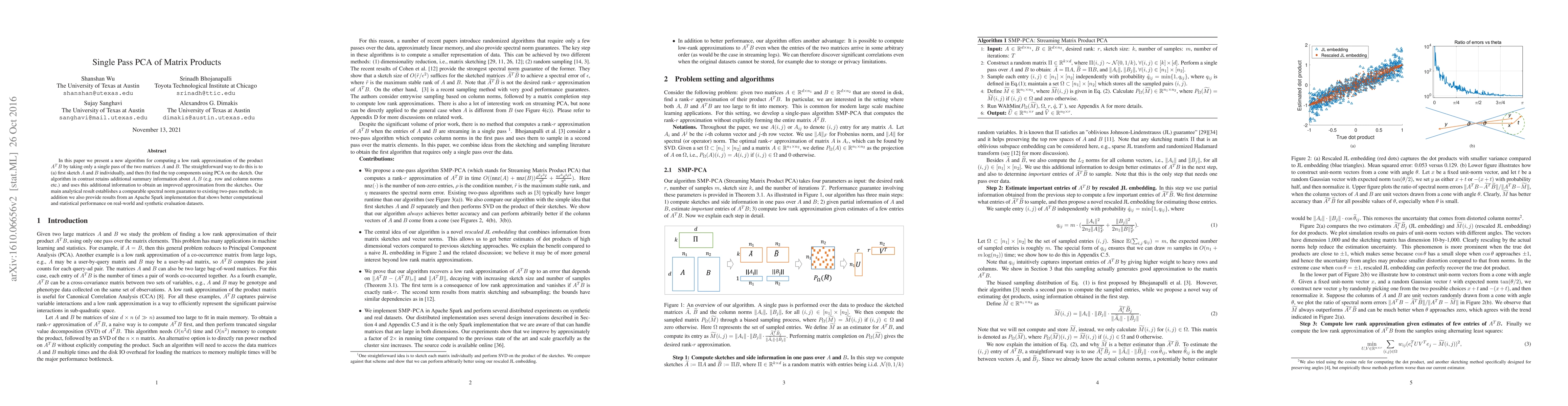 In this paper we present a new algorithm for computing a low rank approximation of the product $A^TB$ by taking only a single pass of the two matrices $A$ and $B$. The straightforward way to do this is to (a) first sketch $A$ and $B$ individually, and then (b) find the top components using PCA on the sketch. Our algorithm in contrast retains additional summary information about $A,B$ (e.g. row and column norms etc.) and uses this additional information to obtain an improved approximation from the sketches. Our main analytical result establishes a comparable spectral norm guarantee to existing two-pass methods; in addition we also provide results from an Apache Spark implementation that shows better computational and statistical performance on real-world and synthetic evaluation datasets.