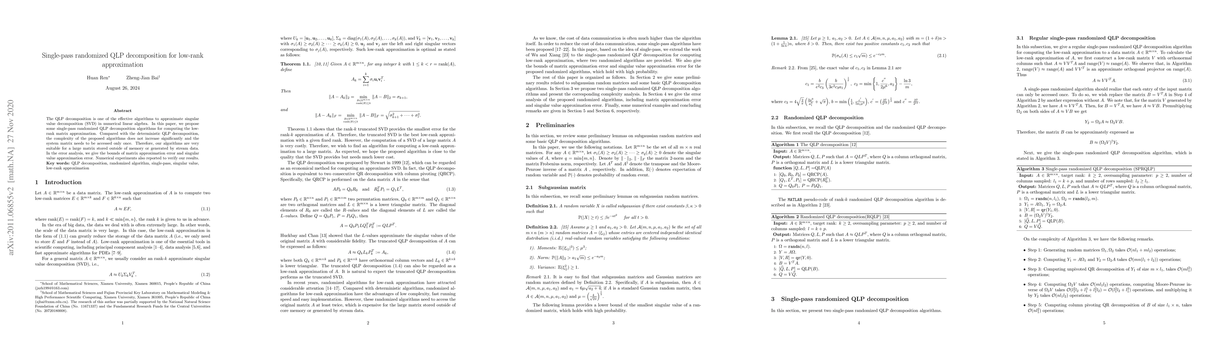 The paper proposes single-pass randomized QLP decomposition algorithms for low-rank matrix approximation that access the system matrix only once, maintaining comparable complexity to deterministic methods. The algorithms are particularly suited for large matrices stored externally or generated by streaming data, with bounds provided for matrix and singular value approximation errors validated through numerical experiments.