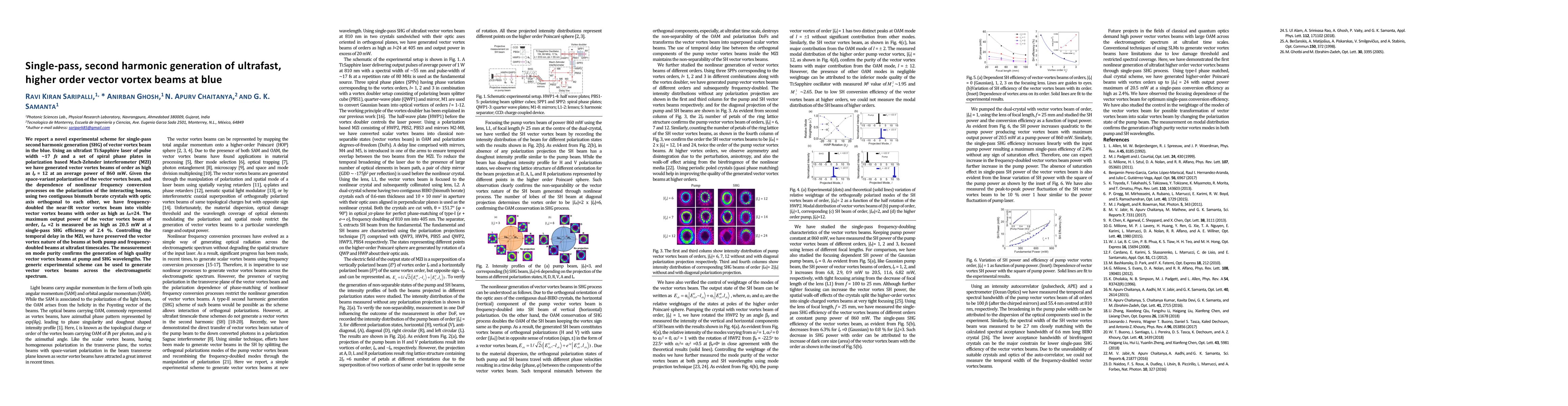 This paper presents a novel method for single-pass second harmonic generation of ultrafast vector vortex beams in the blue using an ultrafast Ti:Sapphire laser. The scheme preserves high-order vector vortex beams with up to lsh = 24, achieving a maximum output power of 20.5 mW at an efficiency of 2.4%.