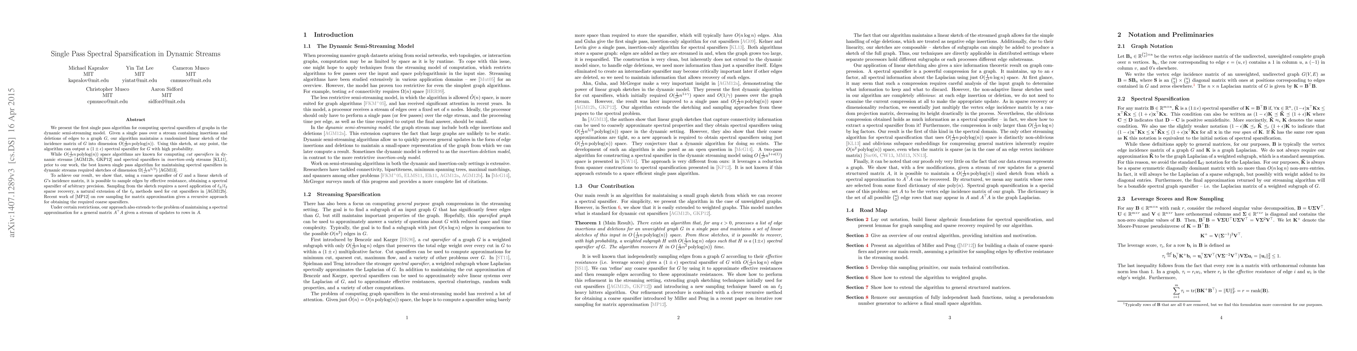 This paper introduces a novel single pass algorithm for computing spectral sparsifiers in dynamic graph streams, achieving a sketch dimension of O((1/epsilon^2) n polylog(n)). This significantly improves upon previous algorithms requiring sketches of dimension Omega((1/epsilon^2) n^(5/3)).