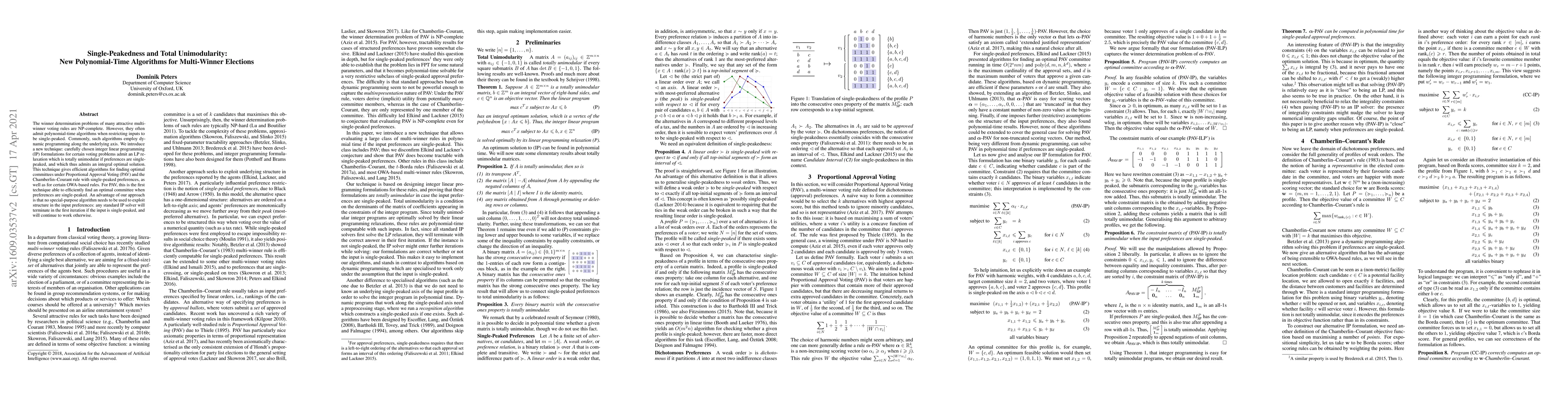 This paper presents new polynomial-time algorithms for multi-winner elections using integer linear programming, leveraging total unimodularity in LP relaxations for single-peaked preferences. It efficiently determines optimal committees under Proportional Approval Voting and the Chamberlin-Courant rule, with no need for special-purpose algorithms.