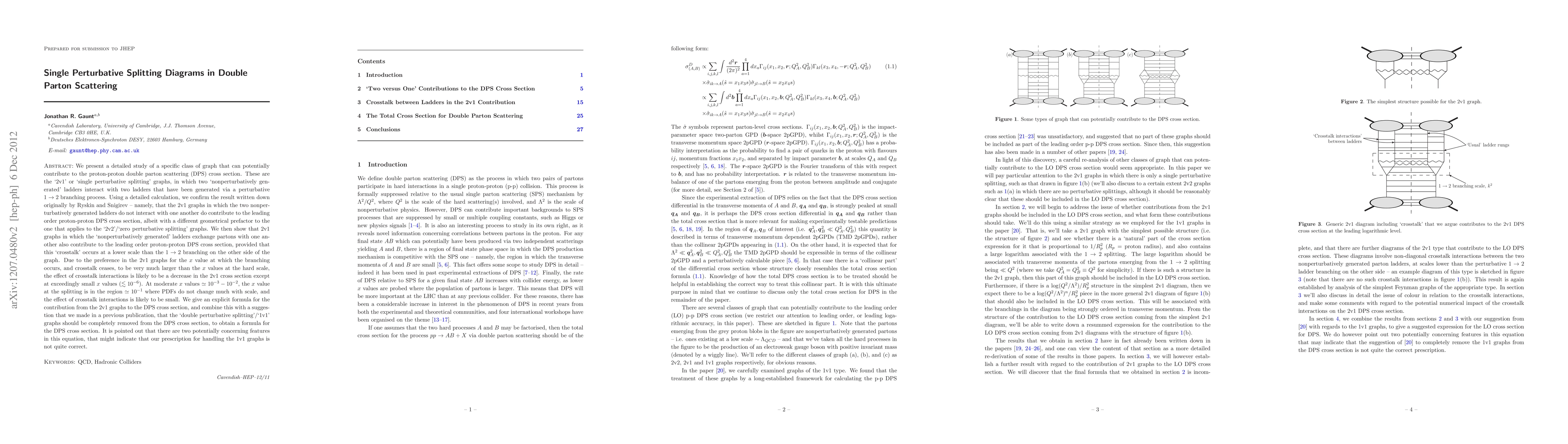 We present a detailed study of a specific class of graph that can potentially contribute to the proton-proton double parton scattering (DPS) cross section. These are the `2v1' or `single perturbative splitting' graphs, in which two `nonperturbatively generated' (NP) ladders interact with two ladders that have been generated via a perturbative 1->2 branching process. Using a detailed calculation, we confirm the result first written down by Ryskin and Snigirev, that 2v1 graphs in which the two NP ladders do not interact with one another do contribute to the LO proton-proton DPS cross section, albeit with a different geometrical prefactor to the one that applies to the `2v2'/`zero perturbative splitting' graphs. We then show that 2v1 graphs in which the NP ladders exchange partons with one another also contribute to the LO proton-proton DPS cross section, provided that this `crosstalk' occurs at a lower scale than the 1->2 branching on the other side of the graph. Due to the preference in the 2v1 graphs for the x value at which the branching occurs/crosstalk ceases to be much larger than x values at the hard scale, the effect of crosstalk interactions is likely to be a decrease in the 2v1 cross section except at very small x values (< 10^-6). At moderate x values ~10^-3 - 10^-2, the x value at the splitting is in the region ~10^-1 where PDFs do not change much with scale, and crosstalk effects are likely to be small. We give an explicit formula for the contribution from the 2v1 graphs to the DPS cross section, and combine this with the suggestion that `double perturbative splitting'/`1v1' graphs should be removed from this cross section made in a previous publication, to obtain a formula for the DPS cross section. We point out that there are two potentially concerning features in this equation, that might indicate that our prescription for handling the 1v1 graphs is not quite correct.